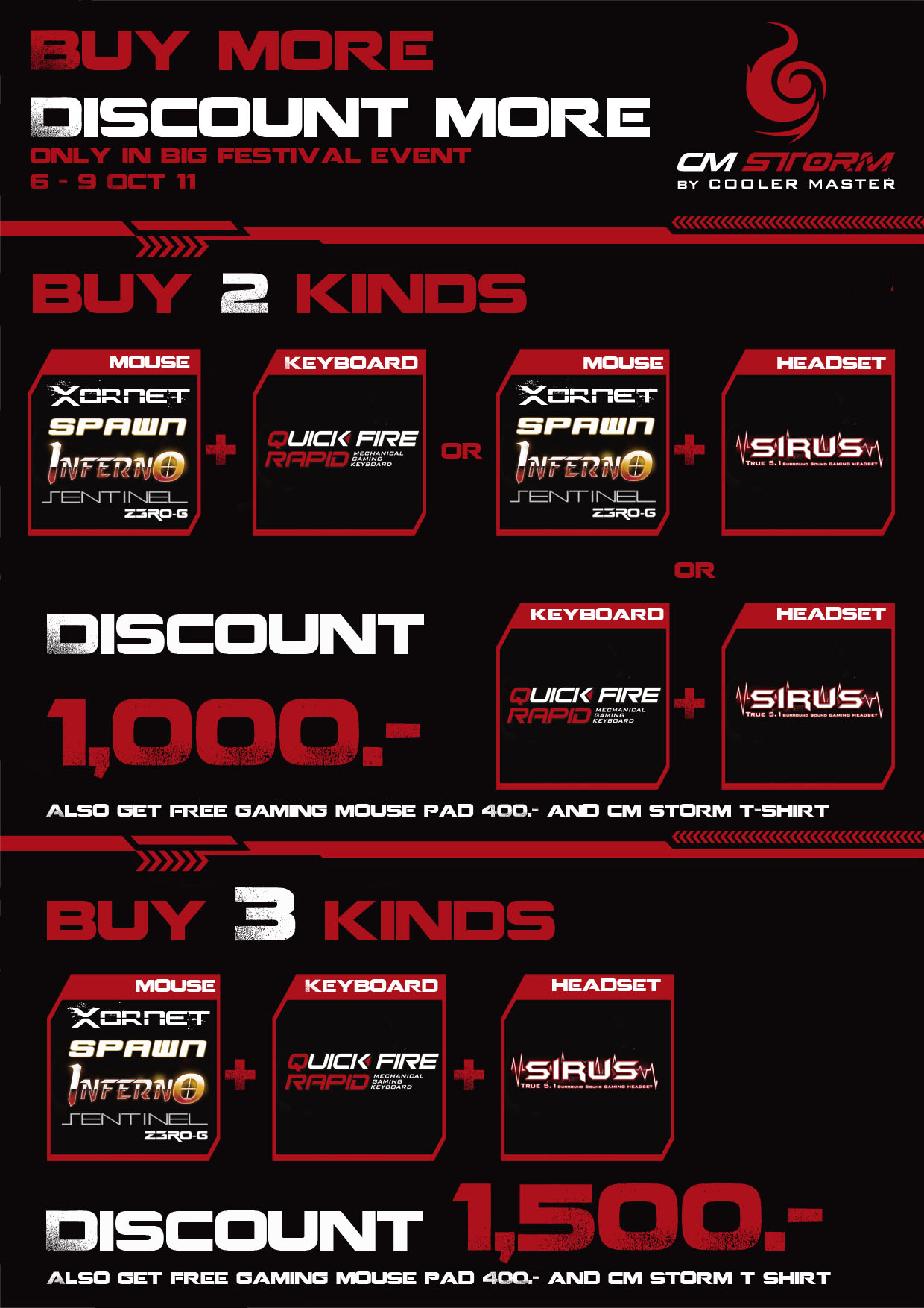 1. ซื้อสินค้าของ CM Storm สองชนิด ลดไปเลยทันที1,000 บาท (เม้าส์รุ่นใดก็ได้ + คีย์บอร์ด Quik Fire Rapid, เม้าส์รุ่นใดก็ได้ + หูฟัง Sirus True 5.1 หรือ คีย์บอร์ด Quick Fire Rapid + หูฟัง Sirus True 5.1)พร้อมรับฟรี!!!แผ่นรองเม้าส์ CS-S BATTLE PAD HD มูลค่า 400 บาทและซื้อยืดเท่ห์ๆ จาก CM Storm ทุกชุด