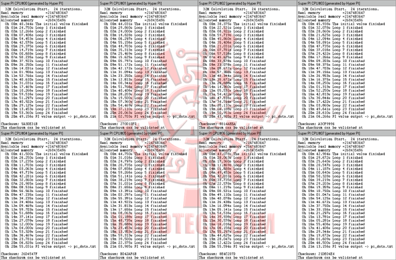 หลังจากได้แรมTriple Channel แท้ๆมา อะไรก็สบายขึ้นครับ เทสต์SuperPI32M ผ่านกัน8หัวสบายๆเลยครับทีนี้ เริ่มด้วยการOverclockแบบเปิดTurbo Mode ทำให้CPUวิ่งไปที่ความเร็วสูงถึง4,237MHz ที่บัส202MHz และผ่านBenchmarkที่หินสุดอย่างSuperPI32M 8Threads พร้อมกันผ่านแบบสบายๆ ซึ่งถ้าเป็นอย่างนี้จริงคงแรงมากเลย แต่ว่ามันไม่จริงนี่สิครับ เพราะเวลามันทำงานจริงหลายๆหัวพร้อมกัน ตัวคูณจะลดลงเหลือแค่20 ความเร็วก็จะตกเหลือแค่4.04GHz เท่านั้น ไม่เอาครับแบบนี้ Vmodtech เราไม่ชอบ แต่เราทำได้ครับ เลยเอามาให้ดูเป็นตัวอย่าง อ้อเวลาที่เห็นช้าๆนี่ เพราะใช้วินโดว์XPแบบไม่ได้Tweakช่วยนะครับ เวลาเลยออกมาแบบนี้