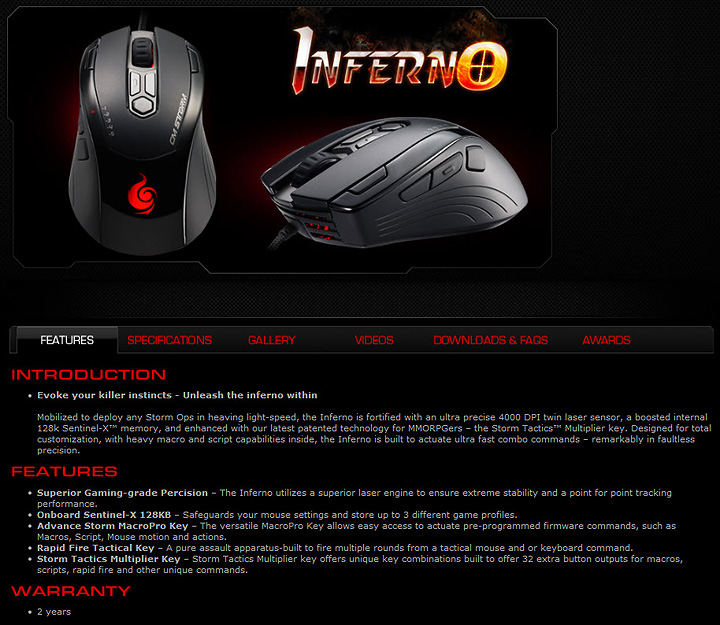 สวัสดีครับ วันนี้คงจะยังมาแนะนำ Gaming Mouse จากค่าย CM Storm กันอีกครั้งคับ วันนี้เป็นรุ่นเกือบใหญ่สุดสำหรับ Gaming Mouse จาก CM Storm ณ วันนี้ครับคือรุ่น Inferno ซึ่งเป็น Laser Mouser ที่มีความละเอียดค่อนข้างมากครับ คือที่ 4000 DPI ตามสเปกมันสามารถปรับค่าได้หลากหลายมากจาก Software ที่แถมมากับกล่อง ซึ่งเราก็สามารถ Download หรือว่า Update ได้จากหน้าเว็บของ CM Storm เองด้วยครับ เรามาชมรายละเอียดกันก่อนครับ