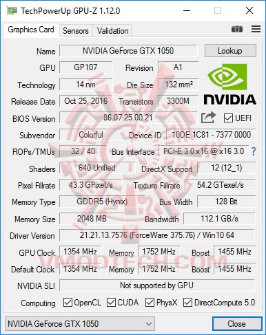Colorful GeForce GTX 1050 2GB from GPUZ