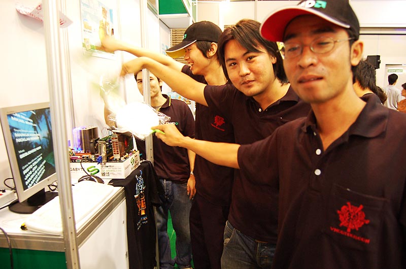 แก๊งค์Vmodtechนั่นเองครับ นำทีมมาโดยพี่มาร์ค Idol ตกอับ ดูโลโซมากเลยครับ เอาเสื้อมาทำป้ายชื่อเวบ แถมมากันแบบออนแอร์จริงๆเอาพัดมายืนพัดเครื่อง อนาถครับ อิอิ