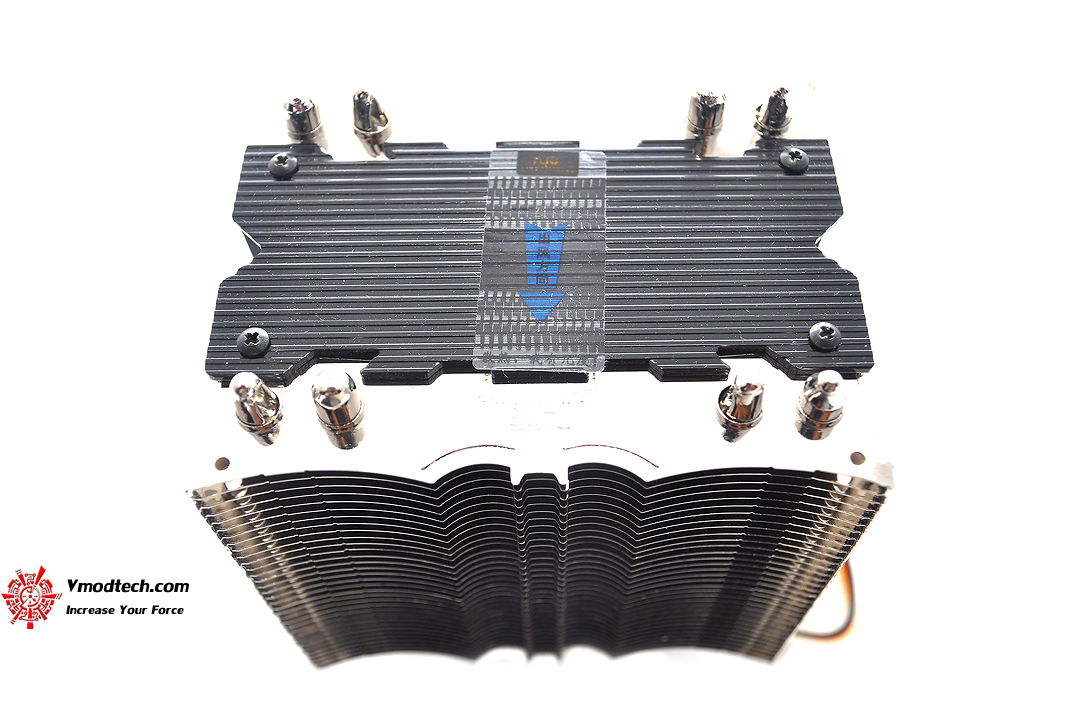 ตัวฮีตซิงค์จะแบ่งเป็นสองฝั่งแยกเป็นฝั่งละ 4ท่อฮีตไปป์ โดยมีพัดลมระบายความร้อนอยู่ตรงกลางทำหน้าที่ระบายความร้อนออกไปนั่นเองครับ โดยพัดลมนั้นมีความเร็วประมาณ 2000รอบต่อนาที เสียงรบกวนนั้นอยู่ที่ 20 dBA ±10% ถือว่าเงียบใช้ได้ครับ