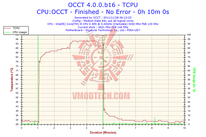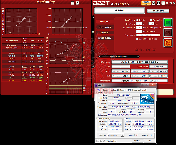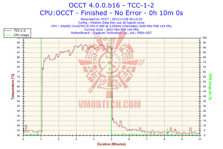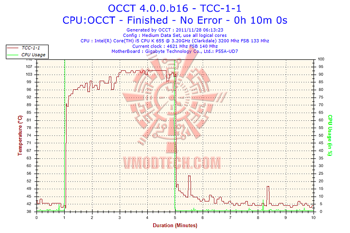 Parameter ในการทดสอบ ผมจะ Overclock CPU intel Core i5 655K ไปที่ 4.62 GHz และป้อนไฟ CPU ไว้เผื่อค่อนข้างเยอะครับ ซึ่งค่านี้จะเป็นค่าที่ใช้เทส Power Supply ของผมด้วย การ Overclock และจ่ายไฟเผื่อแบบนี้จะเกิด Load หนักมากทั้งในเรื่องของความร้อนและอัตราการใช้พลังงานนั่นเอง