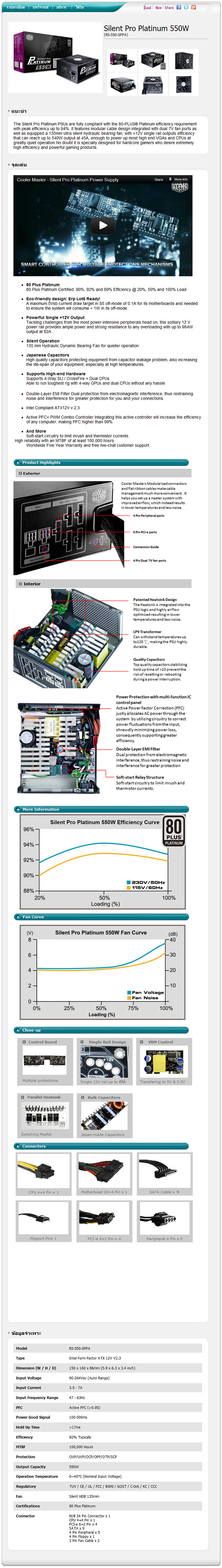สวัสดีครับ วันนี้มี Power Supply หรือที่เราๆเรียกันติดปากว่า PSU จากค่าย Cooler Master รุ่น Silent Pro Platinum 550W มารีวิวให้ได้ชมกันครับ สำหรับพาวเวอร์ซัพพลายในตระกูล Platinum ของค่าย Cooler Master นั้นจะมีอยู่สองขนาดครับคือตัวนี้ 550 วัตต์และ 1000 วัตต์ สำหรับจุดเด่นของ Silent Pro Platinum นี้ก็คือมันได้รับ 80+ Platinum กันเลย อธิบายให้เข้าใจแบบภาษาไทยคือ มันสามารถแปลงไฟฟ้าจาก AC เป็น DC ให้ใช้กับคอมพิวเตอร์ได้อย่างสมบูรณ์ โดยมีความสูญเสียน้อยมากนั่นเอง นั่นเป็นจุดเด่นจุดแรก จุดที่สองก็คือความเงียบเมื่อทำงานครับ จุดที่สามก็คือ มันสามารถถอดสายออกได้เกือบทั้งหมดเลยครับ จะมีแค่สาย 24 pin กับสาย 8 พินซึ่งเป็นสายไฟหลักที่จำเป็นต่อการทำงานของคอมพิวเตอร์เราเท่านั้นที่ต่อเชื่อมออกมาจากแผงวงจรบนตัวถัง ส่วนสายไฟเข้าอุปกรณ์ต่างๆนั้นเราสามารถเลือกได้ครับว่าจะเสียบเส้นไหนบ้าง คือสามารถเสียบได้เท่าที่จำเป็น แบบนี้การจัดสายภายในเคสก็ทำได้ง่ายๆซึ่งจะช่วยให้เราจัดระเบียบทิศทางลมได้เป็นอย่างดี มาติดตามกันต่อเลยครับ