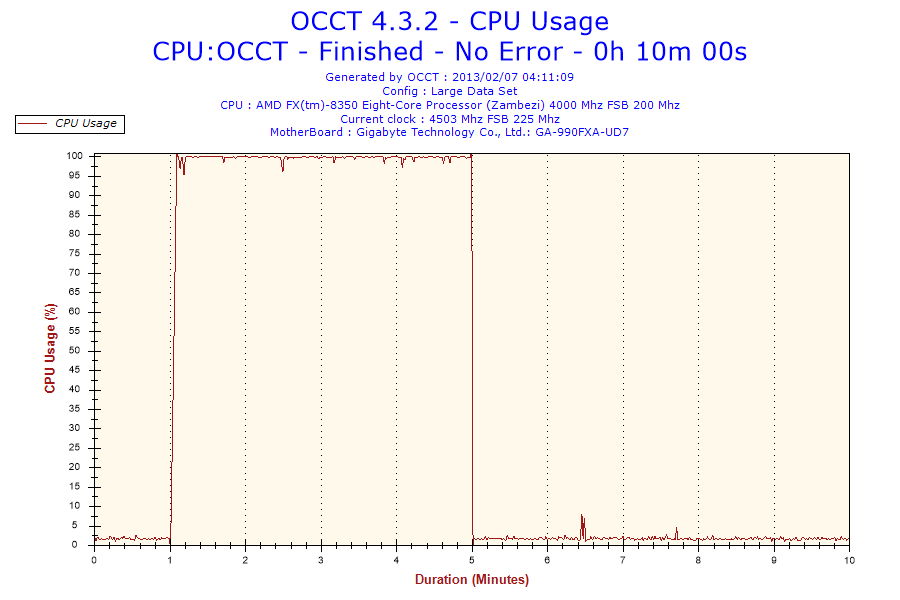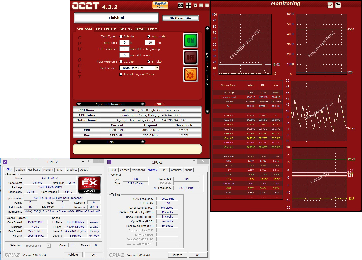 OCCT 4.3.2 test CoreSpeed 4.5Ghz 225X20 HT Link 2925Mhz DDR3 2400 CL9-11-11-24-39 1T NB 2475Mhz