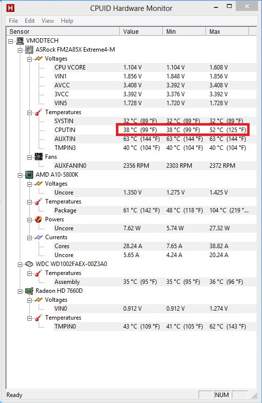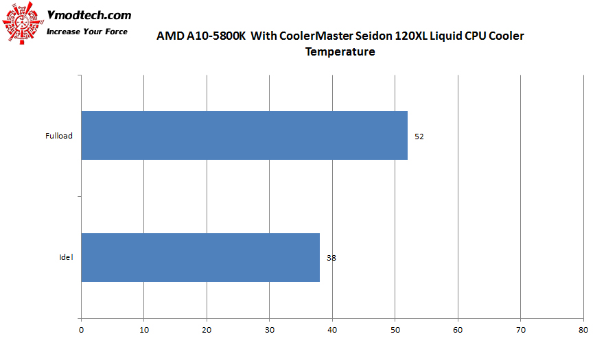 ในส่วนของซีพียู AMD A10-5800K Socket FM2 อุณหภูมิที่สามารถจับสถานะได้อยู่ที่ Idel 38องศาฯ Fulload 52 องศาฯ ในห้องที่อุณหภูมิ 30.6องศาฯ ก็สามารถทำงานได้ดีทีเดียวเลยครับกับการโอเวอร์คล๊อกทั้งสองระบบ แจ่มจริงๆครับกับชุดน้ำเล็กๆแบบนี้