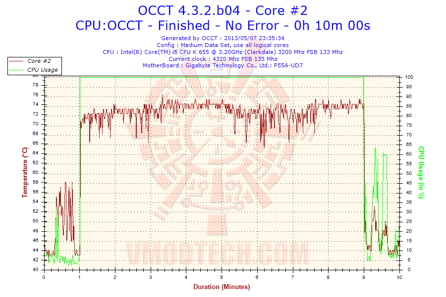 ผมทดสอบโหมด CPU OCCT Medium Data Set เป็นเวลาสิบนาทีน๊ะครับ ภาพนี้จับช่วงหัลงมีโหลดมาให้ดูครับว่าเย็นลงเร็วแค่ไหน ข้อดีของระบบระบายความร้อนด้วยน้ำครับ