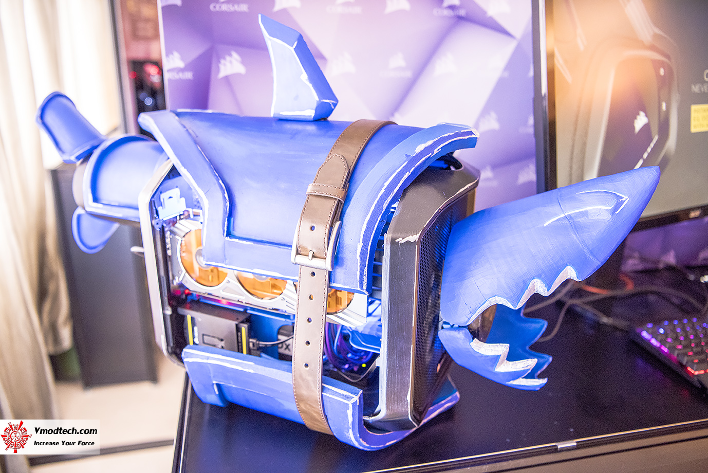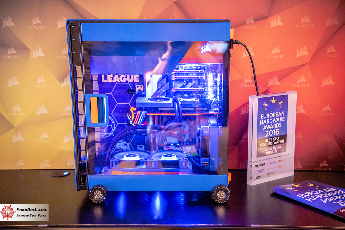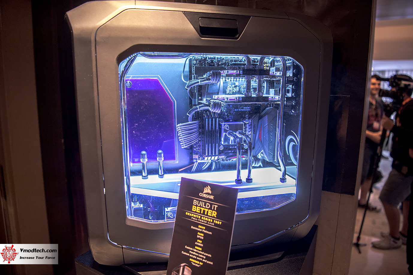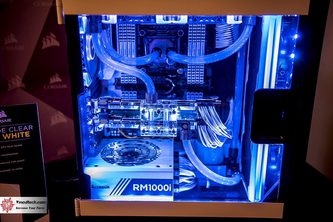 เดินเข้าประตูไปก็จะเจอเคสของทาง CORSAIR ที่ถูกตกแต่งด้วยชุดน้ำจัดเต็มอย่างงดงามนะครับ