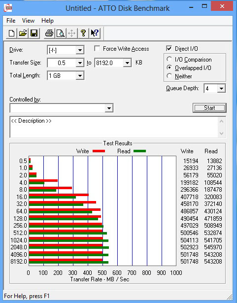 ATTO Disk Benchmark ก็ไม่ธรรมดาเลยครับ อ่านได้เกิน500กว่าๆ เขียนทำคะแนนได้เกิน500 แรงใช้ได้เลยครับแบบนี้