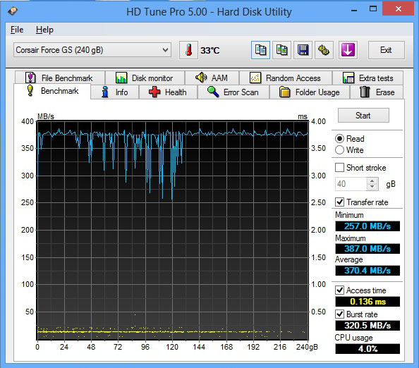แรงใช้ได้เลยครับสำหรับ HDTune Pro แม้จะไม่ไช่รุ่นท๊อปของทาง CORSAIR ก็ตามครับ ผลคะแนนเฉลี่ยอยู่ที่ 370.4 MB/s ถือว่าแรงตามมาตราฐานเลยครับ