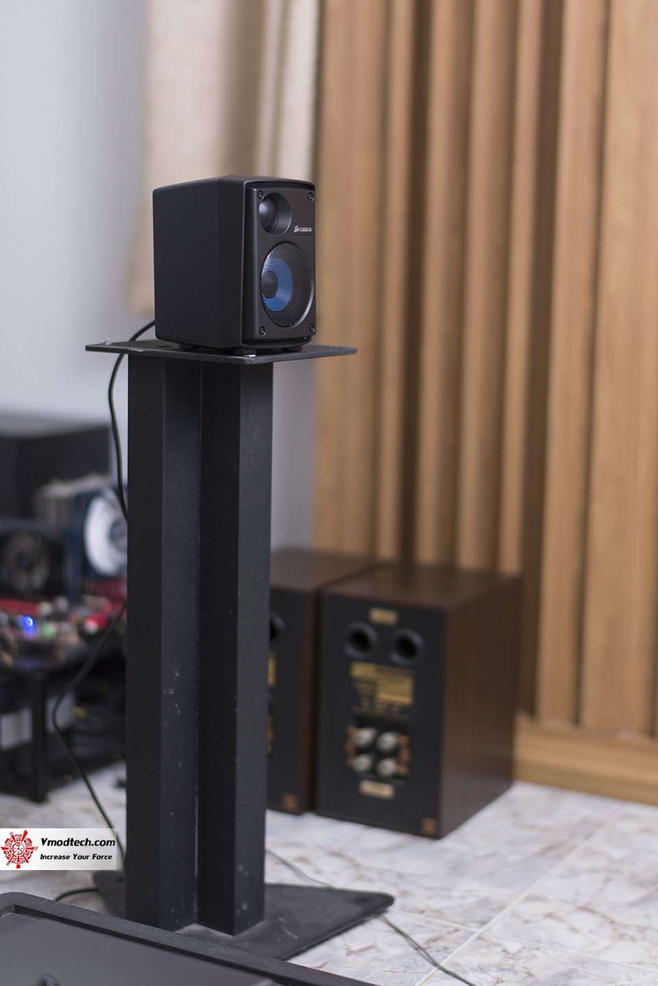 CORSAIR SP2500 นั้นทำให้ผมประหลาดใจพอควรครับเมื่อจัดวางแบบนี้ ระยะห่างระหว่าทวีตเตอร์ทั้งสองประมาณ 168 เซนติเมตร ห่างผนังหลังประมาณ 165 เซน เสียงดีใช้ได้เลยครับ โทนเสียงที่ค่อนข้างแรง ชัด ไดนามิกส์นั้นฟังว่าจะอ่อนด้อยไปซักหน่อย (ตรงนี้ไม่ใช่ข้อตินะครับ เพราะบริเวณที่ตั้งลำโพงฟังนั้นมีขนาดใหญ่เอาเรื่องแอมป์คงไม่ไหว)