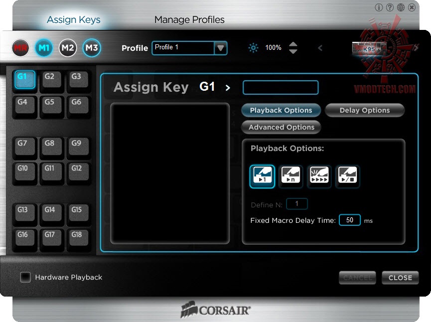 ลองมาดูหน้าตาของ Software ควบคุมคีย์บอร์ดกันครับ ด้านบนนั้นจะเป็นหน้าจอหลักที่จะแสดงสถานะปัจจุบันของปุ่มมาโครทั้ง 18 ปุ่ม แต่เท่านั้นยังไม่พอครับ หาก 18 ปุ่มนั้นยังไม่พอ ท่านสามารถบันทึกเพิ่มเติมบน M2 และ M3 จากหน้าจอด้านซ้ายบนได้อีกด้วย อะไรมันจะมากมายขนาดนี้ ตรงกลางด้านบนจะสามารถบันทึกเป็น Profile แยกออกไปได้ ถัดมาด้านขวาก็จะเป็นปุ่มปรับความสว่างในส่วนของสวิทซ์ทั้งสองโซน