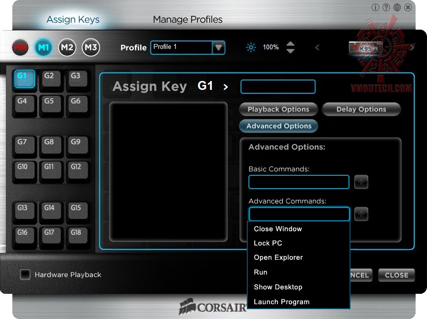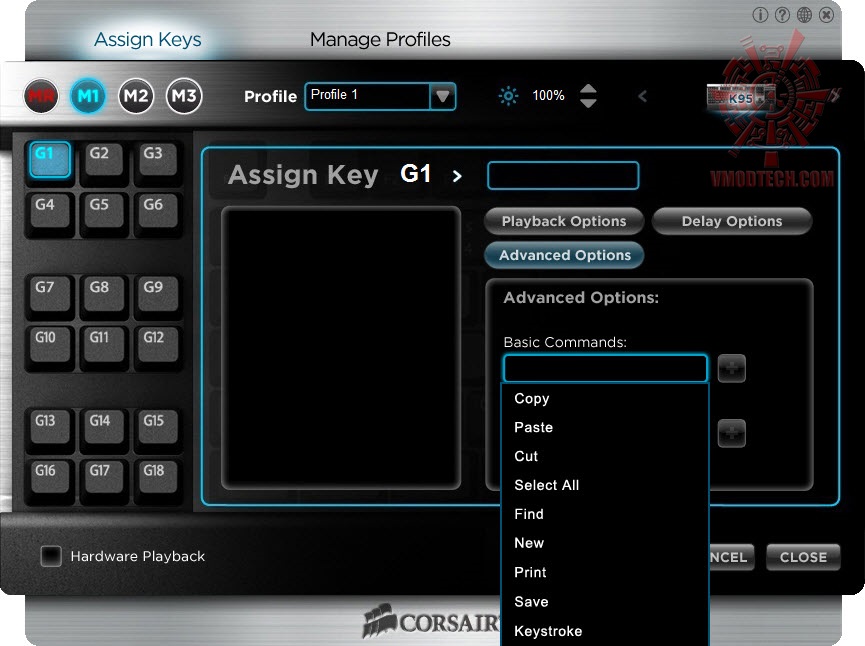 ทดลองบันทึกมาโครดูครับ ผมกด MR (Macro Record) ที่ M1 หลังจากนั้นจิ๊มที่ปุ่ม G1 แล้วเลือนมาด้านขวาบริเวณ Basic Command ตรงนี้จะเป็นการเลือกให้ปุ่ม G1 ทำหน้าที่เป็นฟังก์ชั่นใดก็ได้ตาม Pull Down Menu ที่มีให้เลือกซึ่งในส่วน Basic Command นั้นจะเป็นคำสั่งพื้นฐานทั่วๆไป