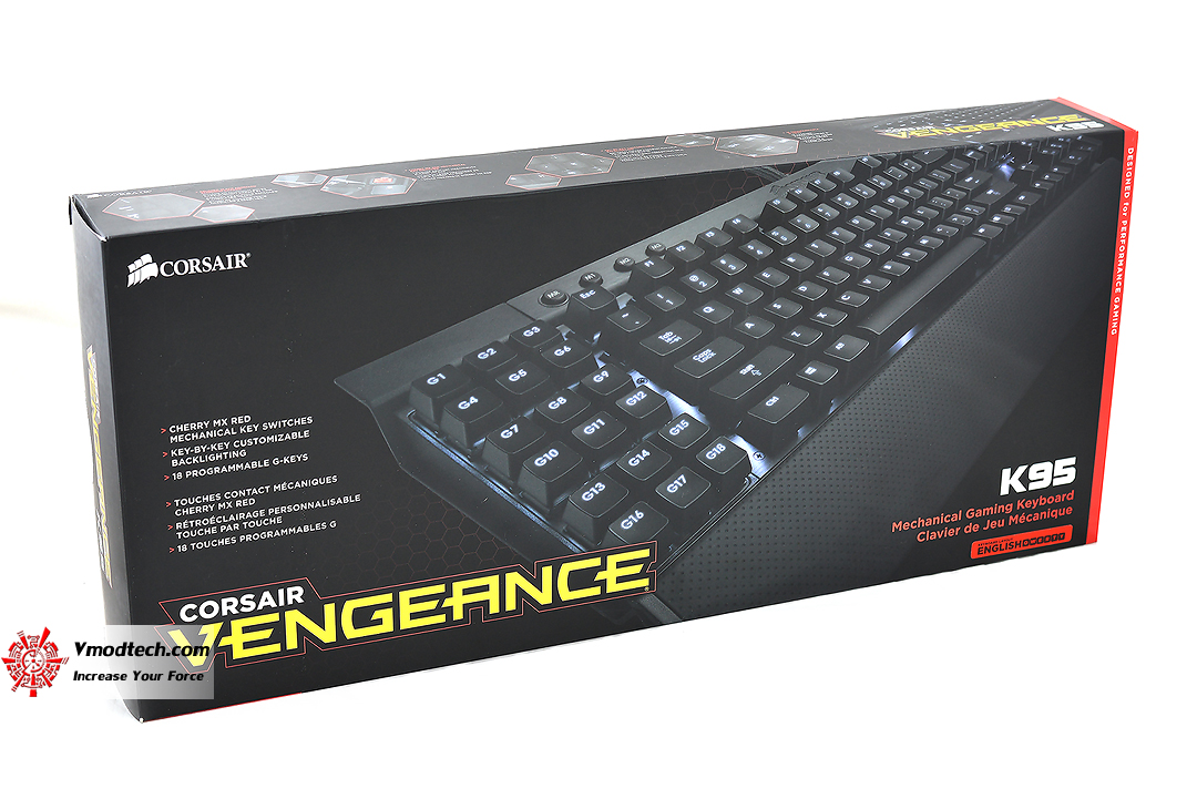 สวัสดีครับ หลากหลายอุปกรณ์ต่อเชื่อมสำหรับเหล่าเกมส์เมอร์ทีออกแบบและคิดค้นโดยแบรนด์ Corsair ก็ได้ผ่านสายตาท่านสมาชิก Vmodtech ไปแล้วนะครับ วันนี้ส่วนตัวนั้นถือเป็นทีเด็ดสำหรับอุปกรณ์เซตนี้เลยเพราะมันเป็นคีย์บอร์ดที่มีดีไซน์ที่เป็นเอกลักษณ์ของตัวเองอย่างมาก สำหรับคีย์บอร์ดในสายการผลิตตระกูล Vengeance นั้นมีให้เลือกหามาใช้งานมากถึง 8 รุ่น และแต่ละรุ่นก็ได้ทำการสกรีนภาษามาให้เหมาะกับผู้ใช้งานทั่วโลก Corsair Vengeance K95 นั้นเป็นคีย์บอร์ดที่ใช้ปุ่มแบบ Mechanical Switch โดยตัว K95 นั้นเลือกใช้สวิทซ์สีแดงหรือ Cherry MX Red Mechanical Switch ซึ่งผมถือว่าเป็นสวิทซ์ที่เสียงเงียบและใช้แรงกดน้อยมาก ก่อนอื่นมาชมรายละเอียดจากหน้าเว็บ Corsair กันก่อนครับ