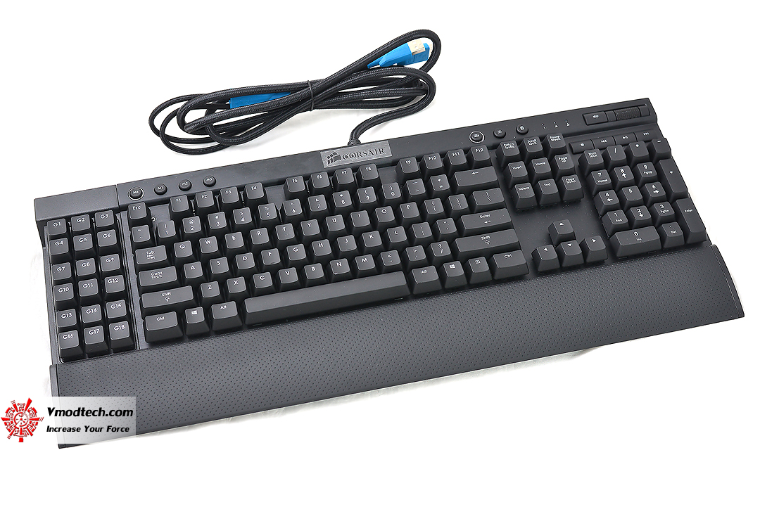 เปิดให้ดูครับว่า Corsair Vengeance K95 นั้นใช้สวิทซ์แบบ Cherry MX Red ที่มีไฟ LED ประจำแต่ละปุ่มเลย ด้านล่างของรูปนี้จะเป็นในส่วน Palm Rest หรือที่พักข้อมือครับ พื้นของที่พักข้อมือนั้นจะมียางปั๊มติดมาด้วย ก็สวยงามและใช้งานได้จริงครับ