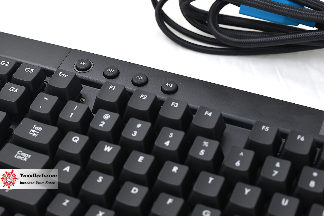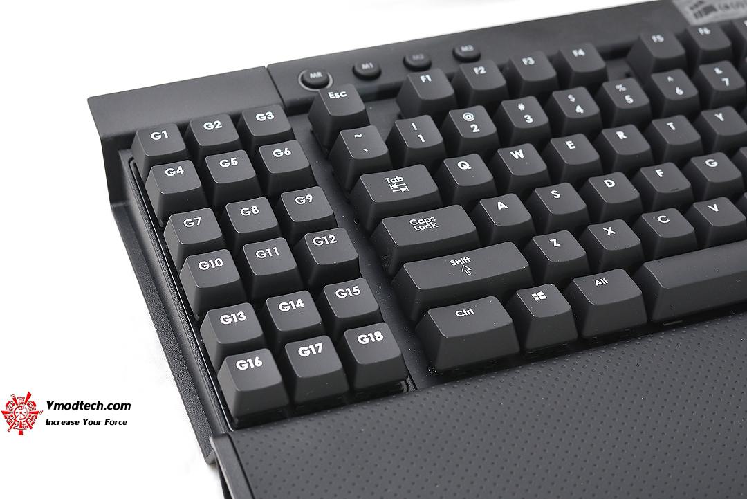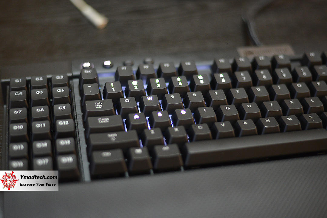 ด้านหน้าเต็มของคีย์บอร์ด ตัวคีย์บอร์ดนั้นมีเลย์เอาท์ที่ยาวมากกว่าคีย์บอร์ดมาตรฐานเนื่องจากด้านซ้ายมือจะเป็นกลุ่มของปุ่มที่เตรียมไว้สำหรับบรรจุ Macro นั่นเอง โครงสร้างของคีย์บอร์ดนั้นจะเป็นอลูมิเนียมขึ้นรูปสีดำปัดด้านมาครับ แลดูเป็นเอกลักษณ์ต่างจากแบรนด์ตลาดที่มีเห็นกันบ่อยๆในบ้านเรา