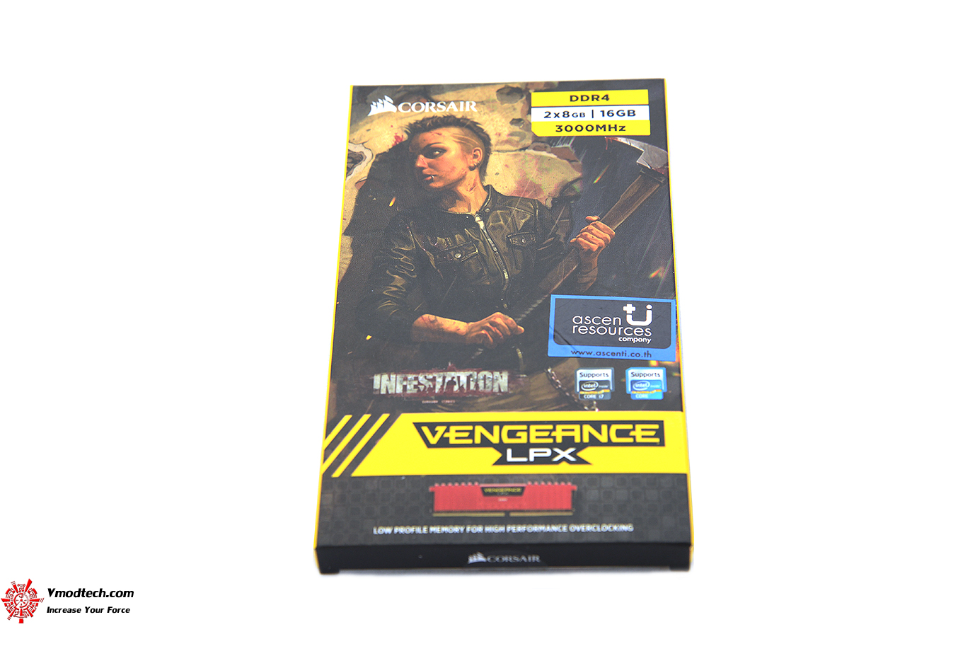 ด้านหน้ากล่องบอกชื่นรุ่น Corsair Vengeance LPX 16GB พร้อมบอกฟีเจอร์คร่าวๆครับ โดยหน้ากล่องมีโลโก้เกมส์ Infestation survivor stories อยู่ด้วย ซึ่งตัวแรมเป็นรุ่น Infestation Limited Edition นั่นเองครับ