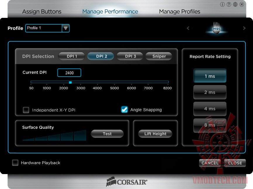 บนหน้า Manage Performance นี้จะเป็นการตั้งค่าความละเอียดของเซนเซอร์ครับ เราสามารถเซตไว้ได้ 4 ระดับความละเอียดเพื่อให้พร้อมกับการยิงในรูปแบบต่างๆ โดยจุดที่น่าสนใจก็น่าจะเป็นปุ่ม Lift Height ที่ผมรู้สึกชอบเป็นพิเศษ หลายๆครั้งครับกับเมาส์ที่ผมรู้สึกชอบแต่มีปัญหาว่า ผมชอบเซตเมาส์ไว้ค่อนข้างช้า คือประมาณ 800 DPI เท่านั้นซึ่งน่าจะเป็นการชินกับการยิงปืนในเกมส์ประเภท FPS ต่างๆ เวลาเคลื่อนที่นั้นต้องใช้พื้นที่มากกว่าปกติทำให้ต้องยกเมาส์กลับมาลากอีกครั้ง เมาส์บางตัวเซนเซอร์แรงมาก ยกแล้วเคอร์เซอร์ยังจะตามกลับมาพร้อมกับเมาส์อีก แต่เมาส์บางตัวความแรงของเซนเซอร์น้อย เวลาเจอพื้นที่ไม่เรียบก็เกิดอาการหลอน เคอร์เซอร์วิ่งไปวิ่งมาอีก แต่กับ M95 ไม่ใช่ครับ เลือกเซตเอาตามความพอใจได้เลย