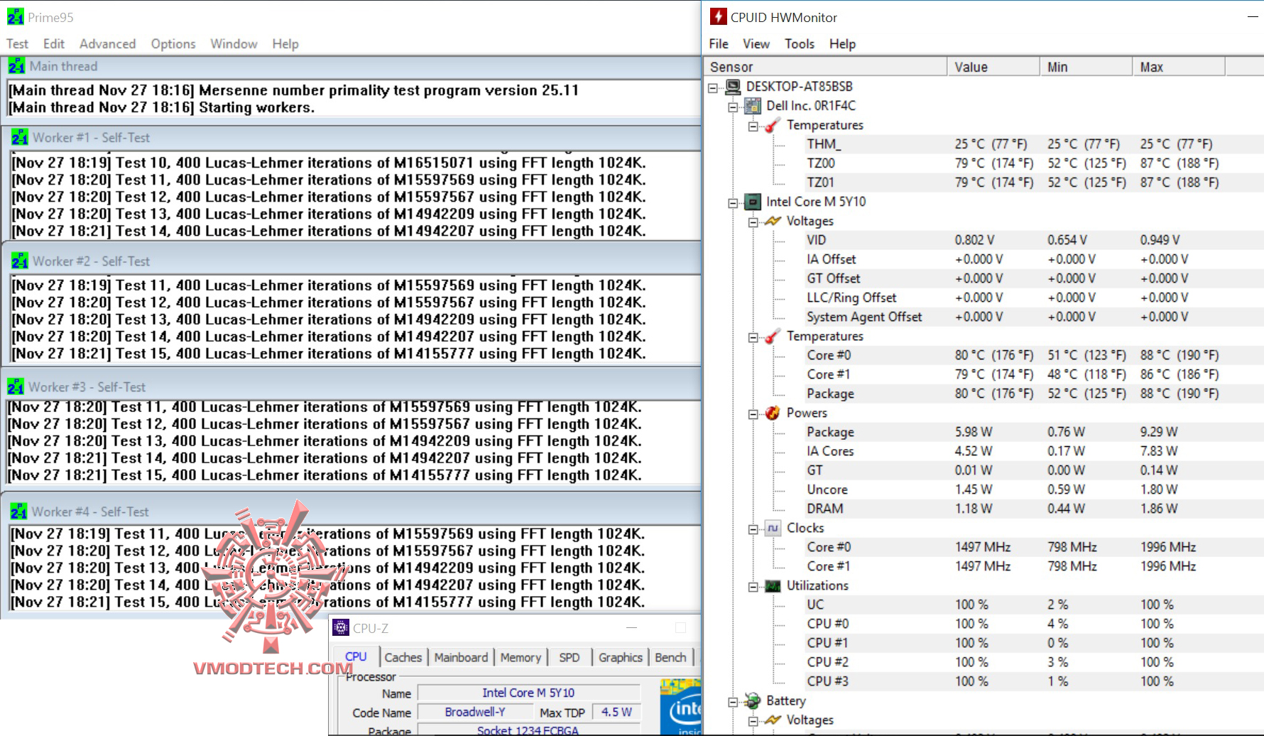 ในการทดสอบอุณหภูมิของซีพียูครับ โดยรัน Prime95 ทิ้งไว้ประมาณเกือบ 10นาที อุณหภูมิสูงสุดจะอยู่ที่ 88องศาครับ แต่จะป้วนเปี้ยนทำงานกันอยู่ที่ 86-88องศาฯครับ ก็ถือว่าโอเคครับ ค่อนข้างเย็นดีเลยทีเดียว