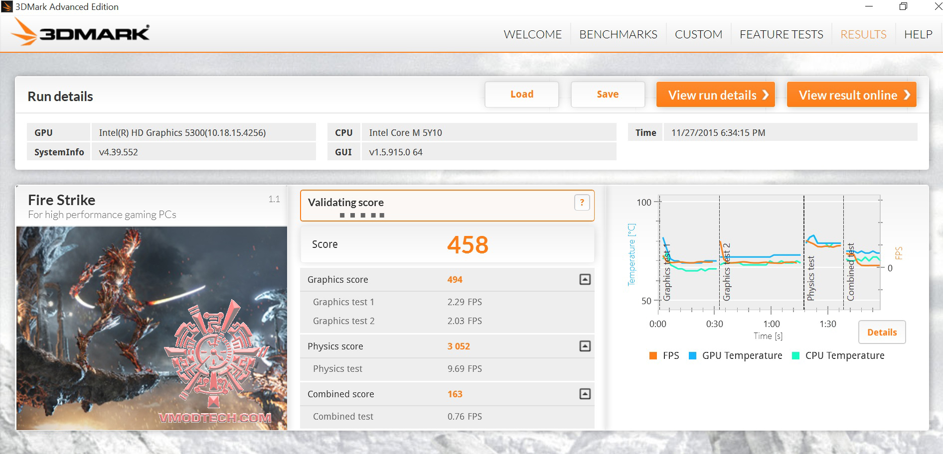 3DMark Fire Strike อยู่ที่ 458คะแนน ในส่วนของการทดสอบ 3D อันนี้ต้องเข้าใจครับว่า IGP ของตัวซีพียูอย่าง Intel HD Graphics 5300 นั้นออกแบบมาให้ใช้งานทั่วไปที่ไม่ได้เน้นงาน 3D มากนัก ถ้ามองโดยรวมกับการใช้งานพรีเซ้น ดูหนัง ฟังเพลง เล่นเกมส์ที่ไม่กินสเปกเล็กๆน้อย ผมว่าผ่านครับ