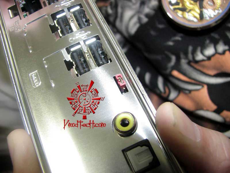 เมื่อประกอบลงเคสและใส่Shieldด้านหลังแล้ว ตัวJumper จะเกือบๆโผล่ออกมา ต้องใช้Jumperหางยาวที่แถมมากับเมนบอร์ดมาเสียบ ก็สามารถจะClear CMOS ได้อย่างเมามันและสะดวกสบายครับ อิอิ