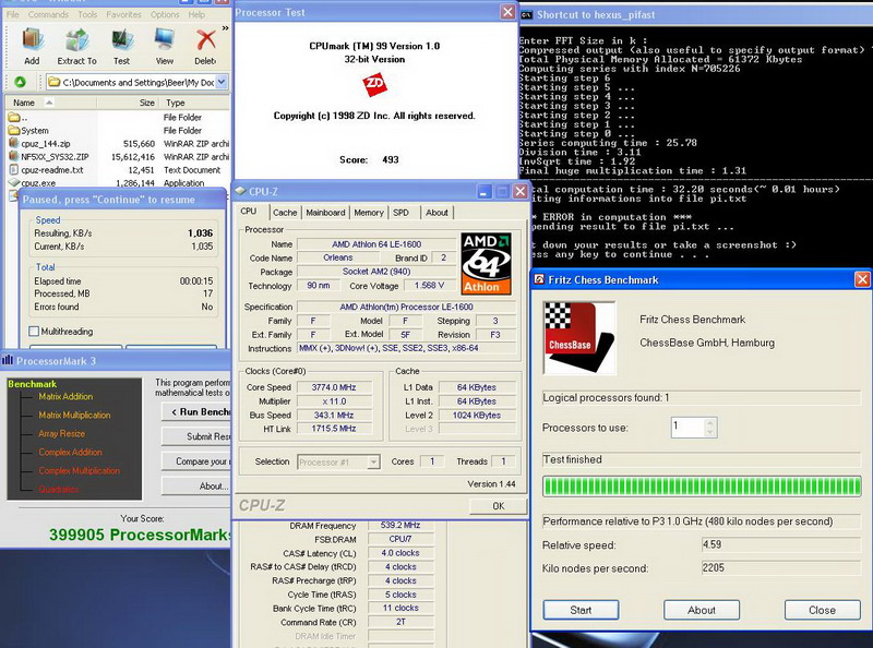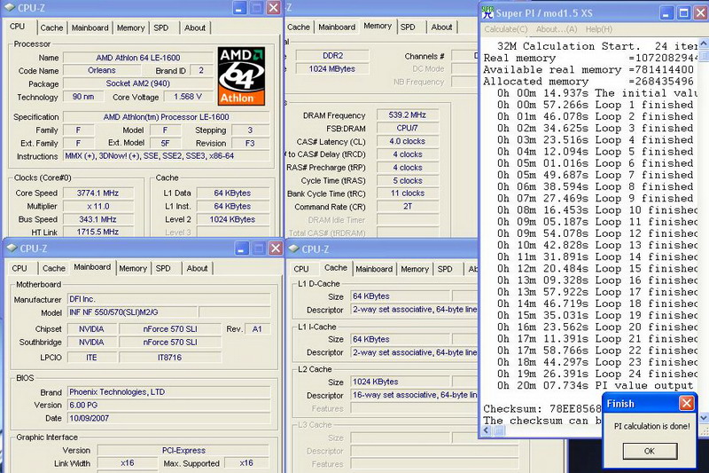 เป็นที่รู้กันอยู่แล้วนะครับว่า เวลาจะ Overclock Mainboard ที่เลือกโดยหลักจะหนีไม่พ้น DFI หรือ อีกหลายๆตัวแต่ขอไม่กล่าวถึงนะครับ เพราะ เรื่องไฟที่จ่ายให้นั้นเองตรงนี้เป็นหัวใจหลักเลยก็ว่าได้ครับไฟที่ได้มาถ้าเหมาะสมปรับแต่งง่ายความแรงก็อยู่ไม่ไกลครับ ไปกันเลยดีกว่า อิอิเริ่มต้นการทดสอบกันเลยนะครับ ตามที่บอกไว้นะครับตรงนี้จะทำให้เห็นถึงบอร์ดสำหรับ OC จริงๆ อิอิ ผมเลยขอเอาเจ้า LE 1600 ที่ความเร็วเดิม 2.2 G พาไปวิ่งเล่นอยู่ที่ 3.77 G โดยไฟที่ผมใช้นะครับ Vcore 1.57Vdim 2.5 พัดลมตัวเดียวเป่าลงบอร์ดทั้งหมด อิอิ