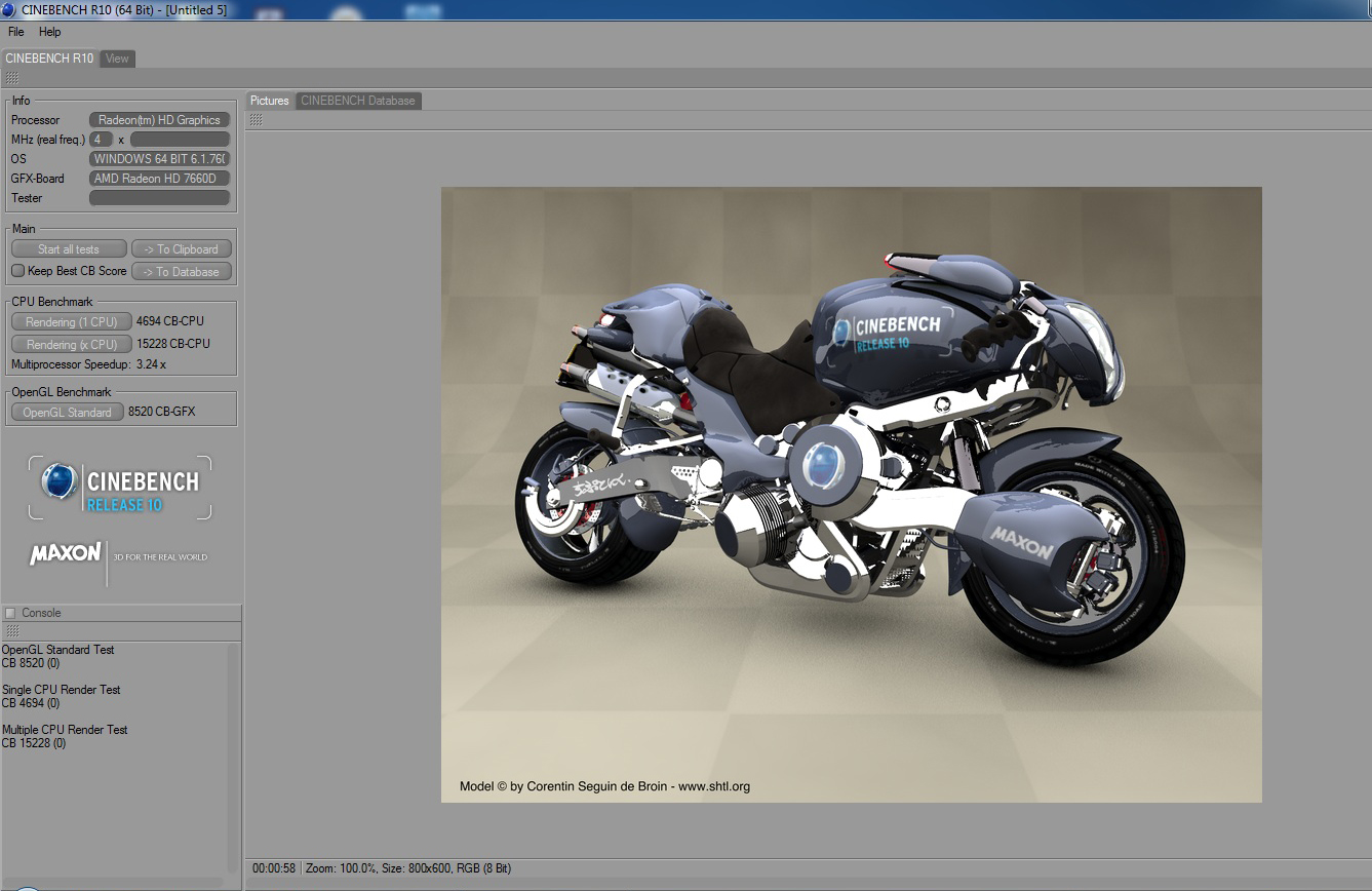 Cinebench R10 ใช้เวลาไป 58วินาทีในการเรนเดอร์ทั้ง 4Core ครับ คะแนนซีพียูเรนเดอร์อยู่ที่ 15228 CB-CPU