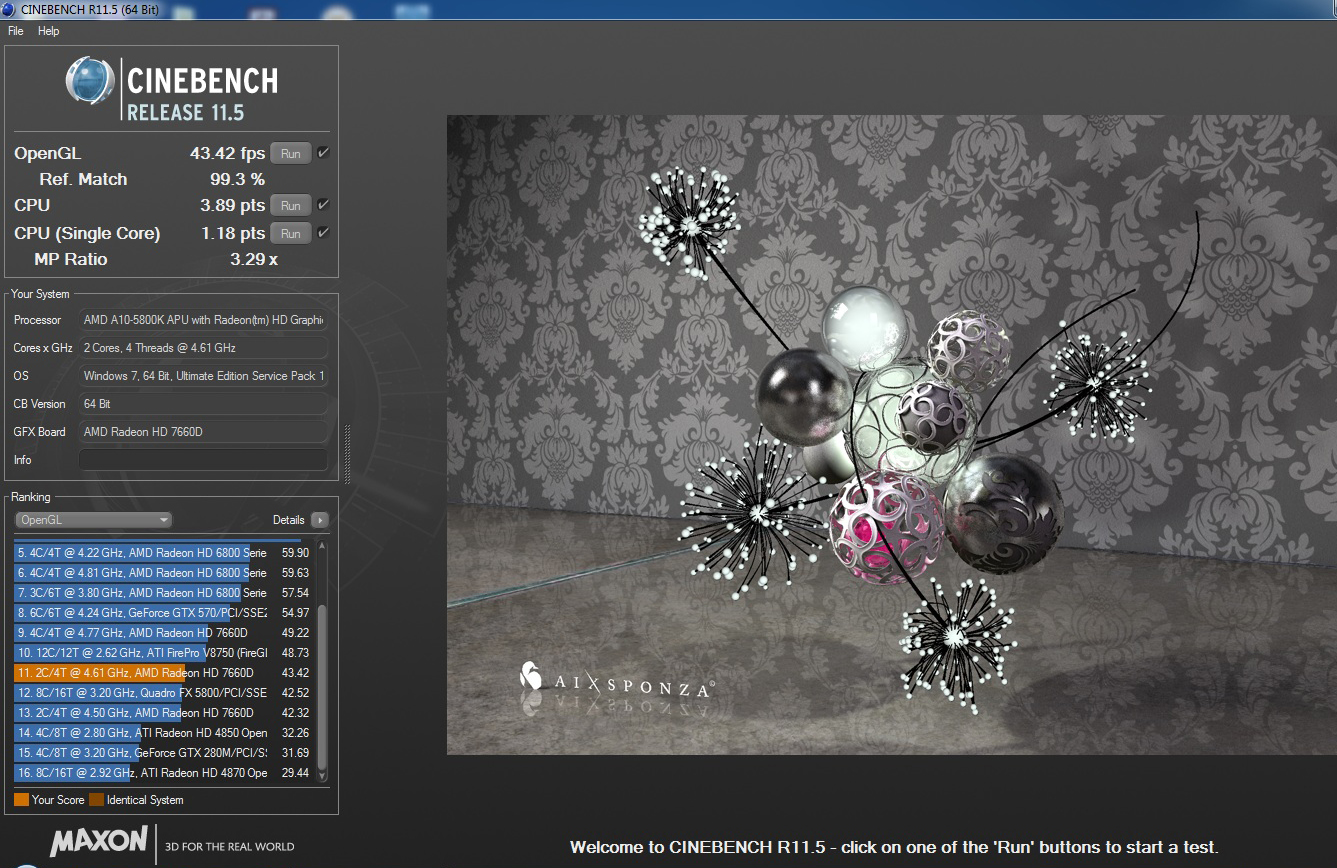 Cinebench R11.5 ในการเรนเดอร์ทั้ง 4Core ครับ คะแนนซีพียูเรนเดอร์อยู่ที่ 3.89PTS หัวเดียว 1Core อยู่ที่ 1.18PTS แจ่มเลยครับ Cinebench R9.5 , R10 , R11.5 ก็แรงกันยกชุดเลยครับ ไม่ธรรมดาครับกับ ECS A85F2-A Gold ที่รีดประสิทธิภาพของ AMD 5800K ออกมาได้ขนาดนี้