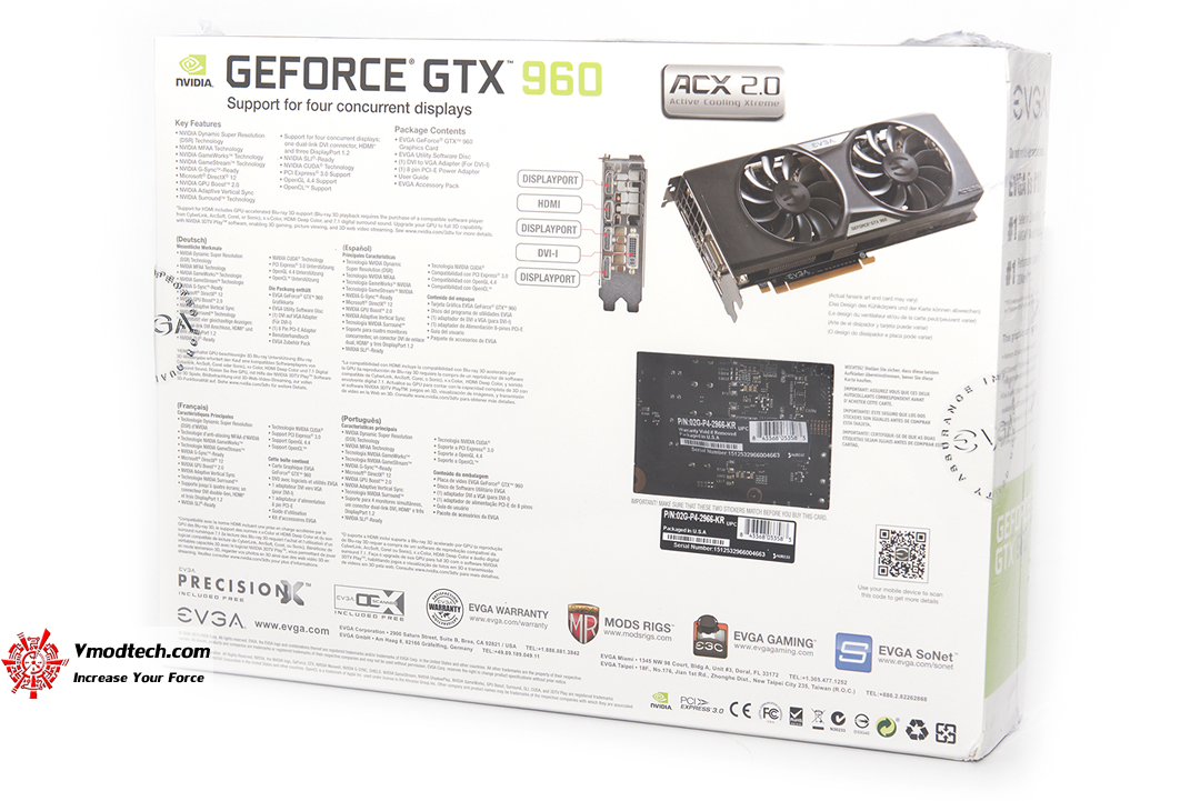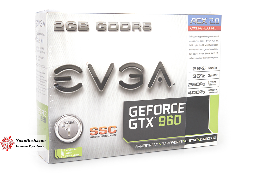 กล่องบรรจุ EVGA GeForce GTX 960 SuperSC นั้นได้ออกแบบมาเป็นเอกลักษณ์ไม่เหมือนใครด้วยโทนสีเขียวอ่อนๆที่เข้ากับสีสัญลักษณ์ของ NVIDIA เลยพร้อมทั้งโลโก้ SSC และ ACX 2.0 ซึ่งเป็นตัวที่บอกว่ามีความเร็วระดับไหนรวมถึงบ่งบอกถึงเทคโนโลยีระบายความร้อนจากชุดระบายความร้อนที่ออกแบบโดย EVGA นั่นเอง