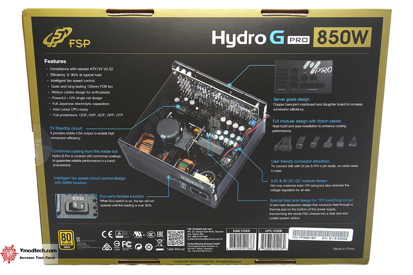 …จุดเด่นฟีเจอร์หลักของ FSP HYDRO G PRO 850W รุ่นนี้ก็คือเป็น PSU แบบ Fully Modular ที่ถอดสายได้อย่างเต็มรูปแบบครับ รวมไปถึงการพัฒนาเทคโนโลยีแบบ IEC62368 ซึ่งได้รับการปรับปรุงอย่างมากในการออกแบบด้านความปลอดภัยรวมถึงขนาดที่กะทัดรัดยิ่งขึ้นโดยไม่ลดทอนประสิทธิภาพการทำงาน รวมไปถึงการออกแบบเทคโนโลยีแบบ LLC Half Bridge Topology with DC-DC Module Design ที่ทำการคุมแรงดันไฟขาออกภายใต้ +/- 1% เมื่อมีการเปลี่ยนแปลงโหลดการทำงานและช่วยให้เพิ่มประสิทธิภาพสูงสุดและความเสถียรของแรงดันไฟฟ้าในการใช้งานอีกด้วยครับ แจ่มจริงๆ ด้วยมาตรฐาน 80Plus Gold ที่เน้นการจ่ายไฟที่เสถียรนิ่งตลอดเการใช้งานอีกด้วยครับ อีกทั้งยังมีระบบ ECO Switch ที่ใช้งานเปิดปิดพัดลมให้ทำงานต่ำประหยัดพลังงานได้อีกด้วยและมาพร้อมการป้องกันความชื้นหรือสภาพที่บรรดา PSU รุ่นอื่นทำงานไม่ได้ แต่สำหรับ FSP HYDRO G PRO 850W นั้นสามารถทำงานได้ที่ 95%RH กันเลยทีเดียวครับ ส่วนจะมีประสิทธิภาพการทำงานจะเป็นเช่นไรนั้นเดี๋ยวเราไปชมในรีวิวกันได้เลยครับ
