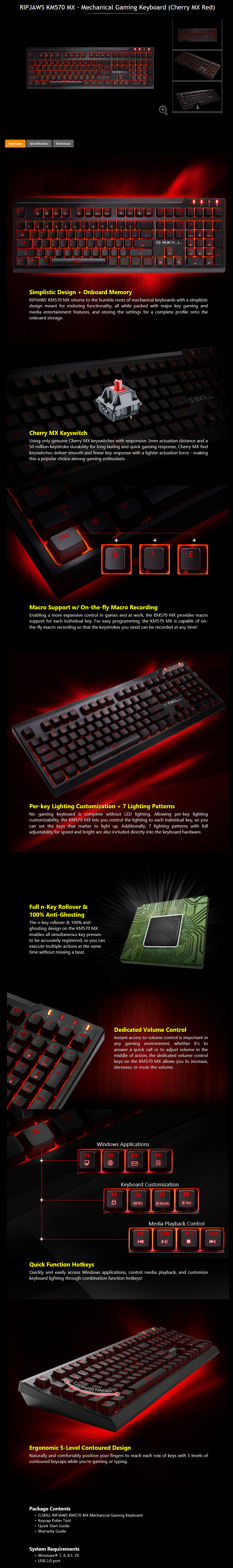 RIPJAWS KM570 MX นั้นเป็นคีย์บอร์ดแบบเรียบง่ายครับ สวิทซ์นั้นเลือกใช้สวิทซ์ที่มีคุณภาพจาก Cherry MX ที่มีความทนทานต่อการกดได้มากถึง 50 ล้านครั้ง ตัวคีย์บอร์ดสามารถตั้งมาโครได้อย่างง่ายดายจากเพียงการกดปุ่มบนคีย์บอร์ดเอง ตัวคีย์บอร์ดนั้นได้ทำการติดตั้ง Pre-Key Lighting มาให้เราสามารถเลือกใช้ได้เลยถึง 7 รูปแบบครับ พร้อมกันนั้นมันยังรองรับ Full n-Key Rollover และ Anti Ghosting ด้วย นอกจากนั้นฝาครอบสวิทซ์นั้นได้ถูกออกแบบให้โค้งมนเพิ่มความสะดวกสบายเมื่อพิมพ์ไปนานๆด้วย