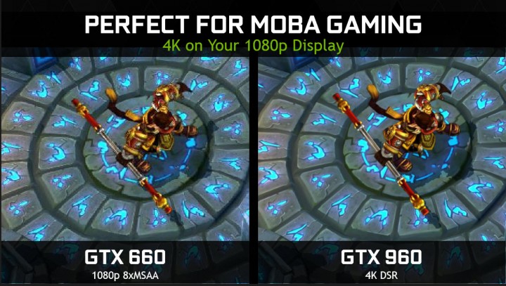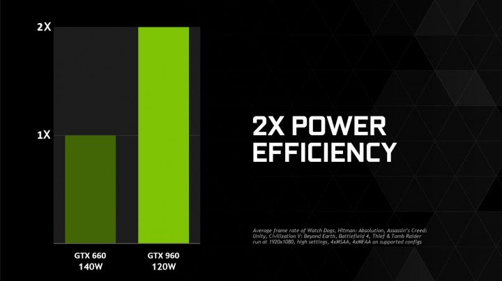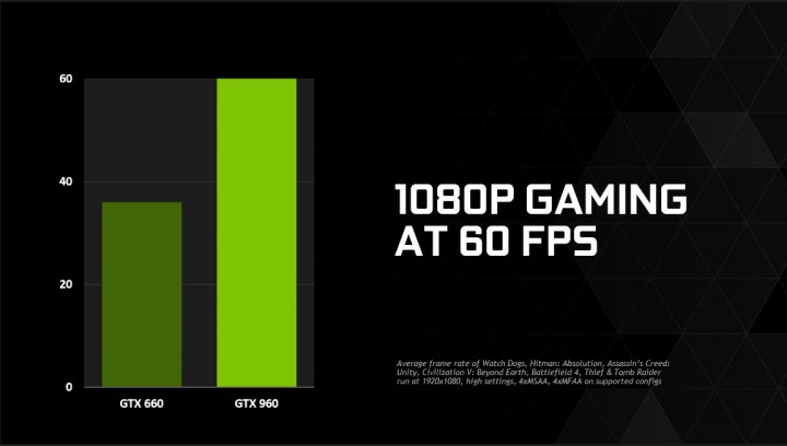 GTX 960 นั้นมีพลังที่จะขับเคลื่อนเกมส์ดังๆเหล่านั้นได้เป็นอย่างดีที่เฟรมเรทเฉลี่ย 60 เฟรมต่อนาที ซึ่งถ้ามองกันตรงๆคือมากกว่า GTX 660 ที่ได้เพียงไม่เกิน 40 เฟรม เมื่อเปรียบเทียบ GTX 960 กับ GTX 660 นั้นจะเห็นได้ว่า GTX 960 นั้นมีการพัฒนาต่อยอดได้อย่างสมบูรณ์แบบ เพียบพร้อมไปด้วยคุณสมบัติพิเศษๆเช่น VXGI และ MFAA ซึ่งถือว่าเป็นเทคโนโลยีลบรอยหยักของเจนเนอร์เรชั่นต่อไปซึ่งจะพบได้บน DirectX ตัวที่กำลังเปิดตัวจาก Microsoft