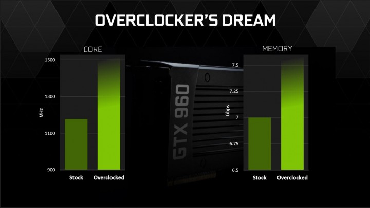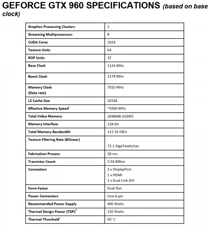 Base clock ของ GTX 960 นั้นจะอยู่ที่ 1126 MHz และจะมีการบู๊สได้สูงขึ้นไปที่ 1178 MHz ซึ่งจะขึ้นอยู่กับโหลดขณะใช้งานนั้นๆ และจะมีเมมโมรี่ที่มีความเร็ว 7010 MHz Output นั้นออกแบบให้สามารถต่อออกได้หลายจอและมีขั่วต่อเชื่อมหลากหลายเพื่อรองรับชนิดของจอที่วางตลาดอยู่ทั้งหมด ระดับการวางตัวของ GTX 960 นั้นจะอยู่ตรงกลางระหว่า GTX 970 และ GTX 750Ti