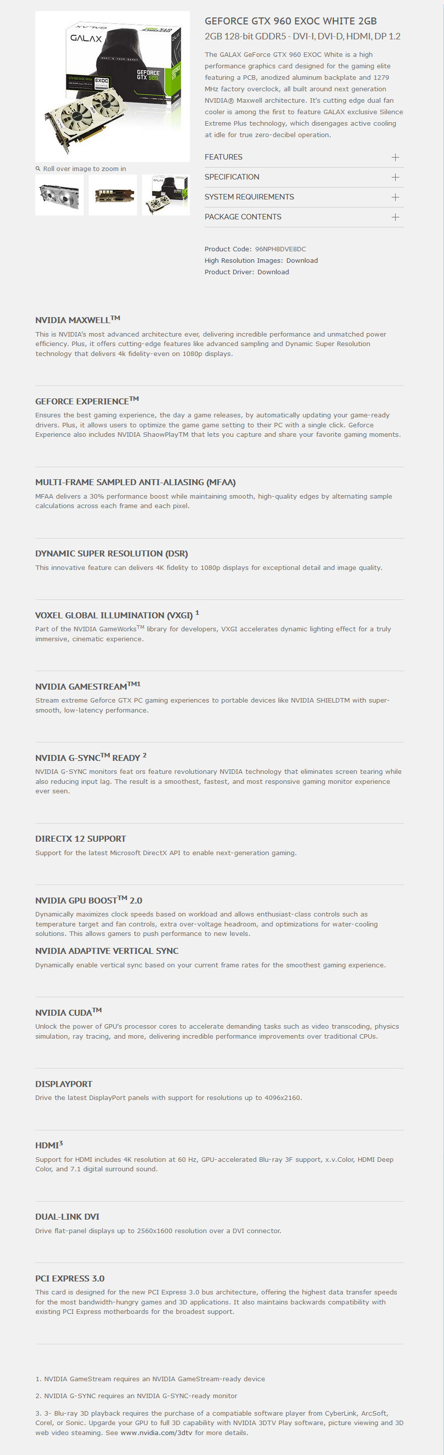 ……….สวัสดีครับ วันนี้ มาพบกับกราฟิกการ์ดรุ่นกลางๆหน้าตางามๆ กันบ้างครับกับ GALAX GEFORCE GTX 960 EXOC WHITE 2GB ใครที่ชอบอะไรที่มากกว่ากราฟิกการ์ด วันนี้ถูกใจแน่นอนครับ ซึ่งเจ้า GALAX GEFORCE GTX 960 EXOC WHITE 2GB เป็นหนึ่งในตละกูล EXOC WHITE Edition เป็นรุ่น Overclock มาจากโรงงานครับ และตัวกราฟิกการ์ด เป็นสีขาว วัสดุที่ใช้นั้นคัดเกรดมาไม่แพ้รุ่นใหญ่ครับทั้ง และ Features ต่างๆก็จัดเต็มมาแบบไม่มีกั๊ก จะเป็นอย่างไรเดี๋ยวได้รู้กันครับ แต่ก่อนอื่นต้องขอเชิญชมรายละเอียดจากเว็บไซค์ผู้ผลิตกันก่อนเลยครับ