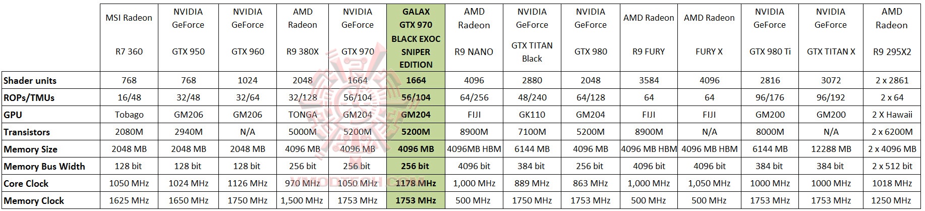 ตารางเปรียบเทียบ GALAX GTX 970 BLACK EXOC SNIPER EDITION กับการ์ดในยุคปัจจุบัน จะเห็นได้ว่าตัวการ์ดนั้นได้ทำการปรับแต่งความเร็วคอร์ให้สูงกว่าปกติถึง 128 MHz