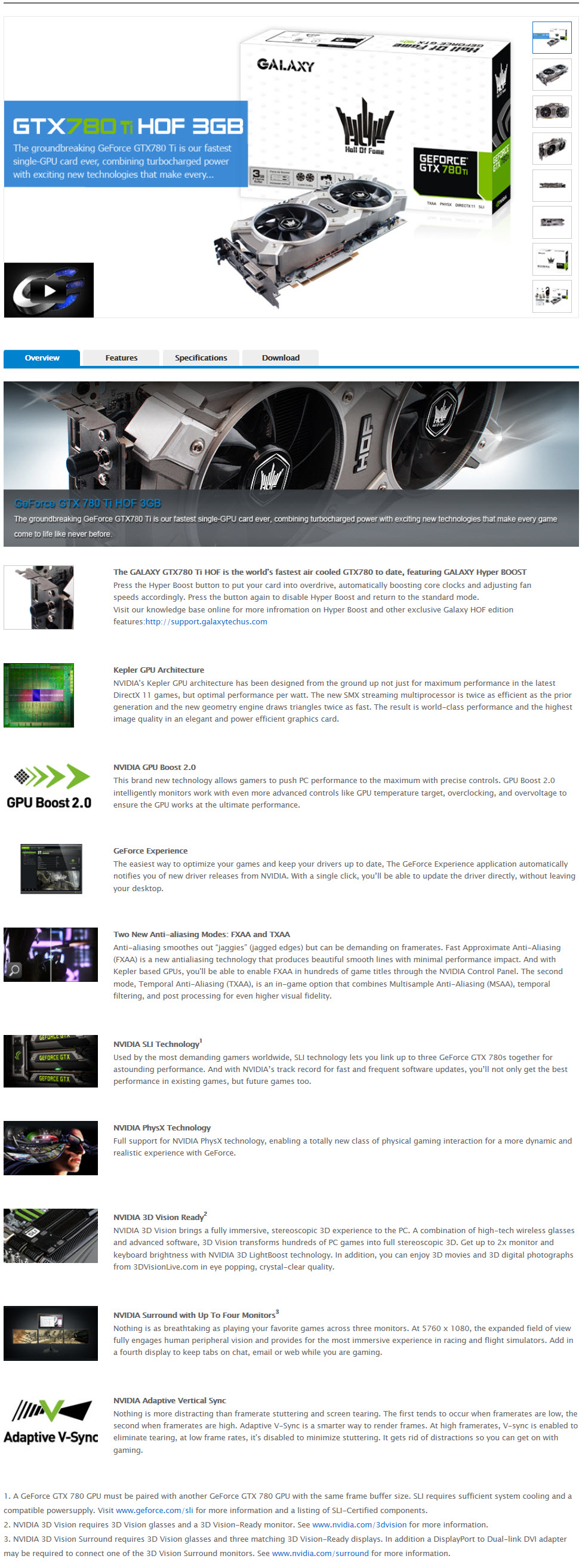 GALAXY GeForce GTX 780 Ti HOF นั้นได้ถูกออกแบบจากพื้นฐานของการ์ด NVIDIA GeForce GTX 780 Ti โดยเพิ่มความเร็วคอร์เข้าไปและติดตั้งชุดระบายความร้อนที่เป็นเอกลักษณ์พิเศษสุดๆของ Galaxy เข้าไป