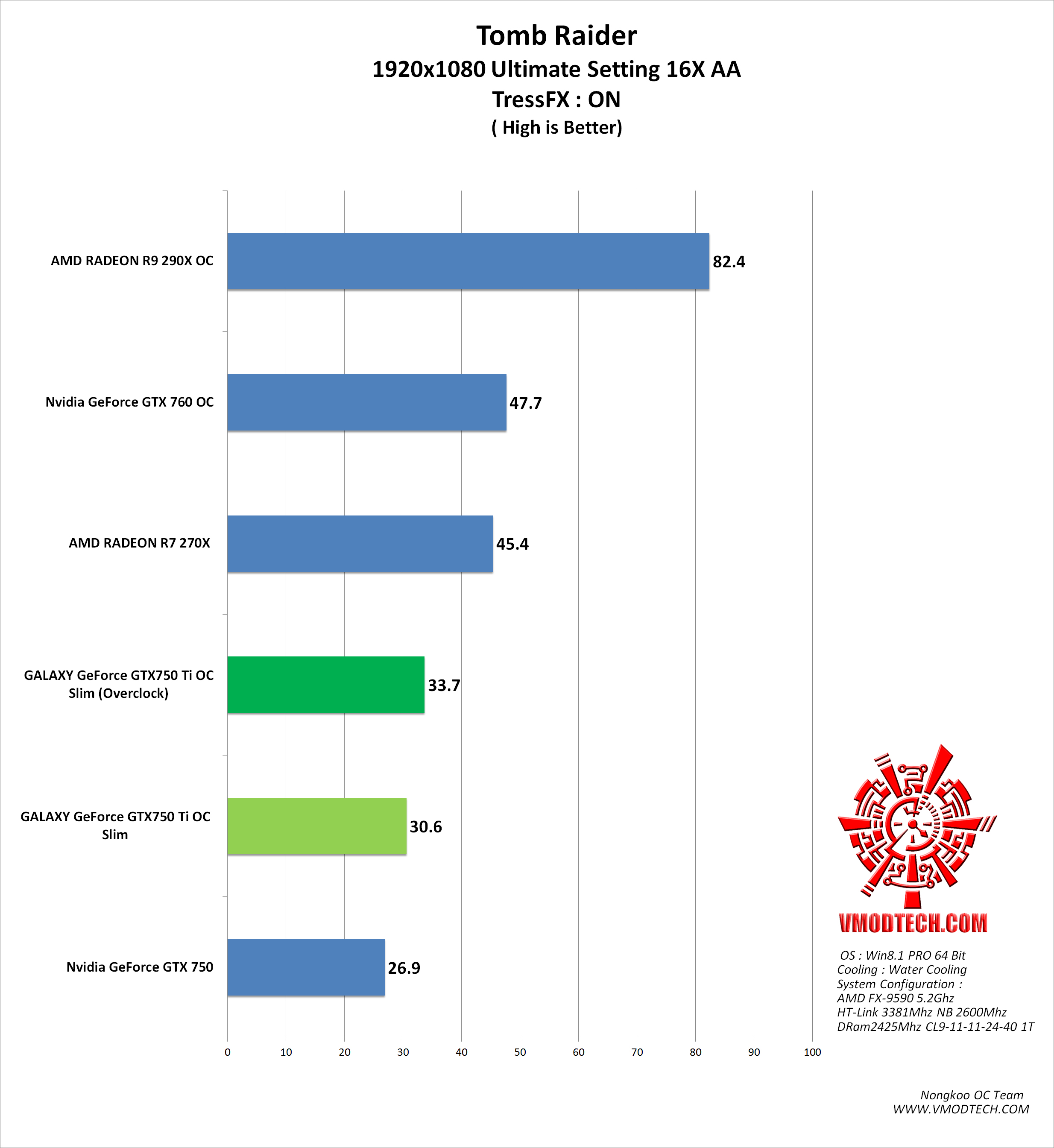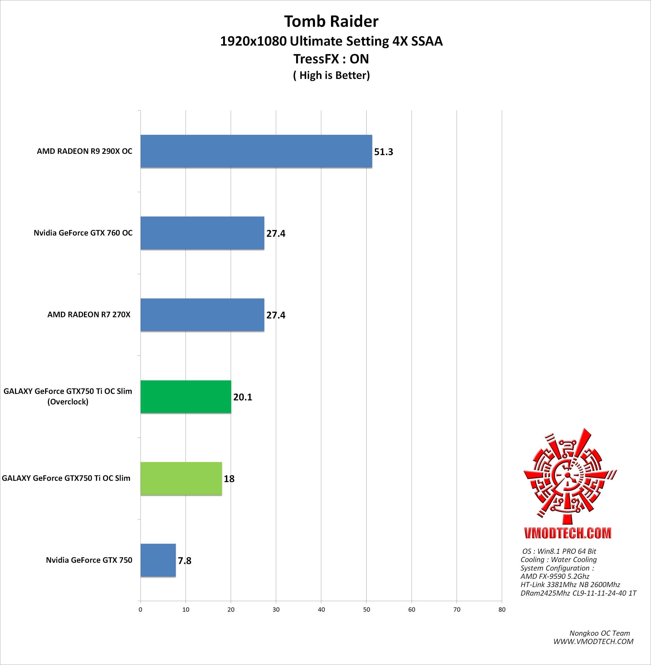 สำหรับ Tomb Raider เปิดในโหมด Ultimate TressFX ON FXAA แบบสุดหมด 33.7เฟรมเรตครับ ส่วนถ้าเปิด MSAA 4X แบบเต็มๆอยู่ที่ 20เฟรมเรต ใช้งานจริงควรลดรายละเอียดลงมาให้เหมาะสมเล่นได้ลื่นแน่นอนครับ