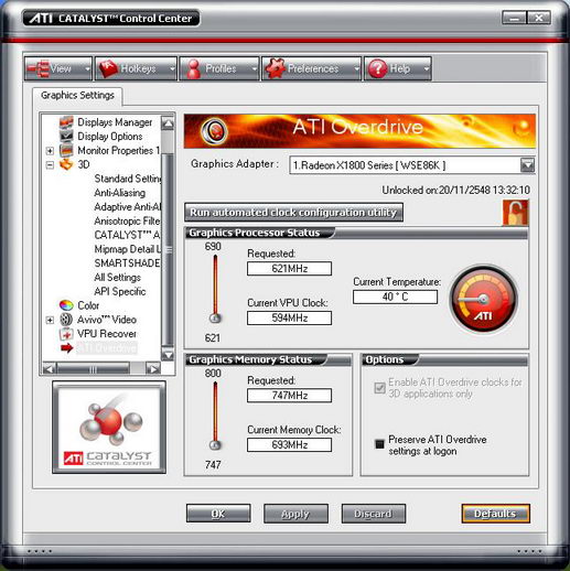 ถ้าจะลากการ์ดให้ไกลกว่านี้ ก็คงต้องใช้พวกโปรแกรมIndyทั้งหลาย ที่ไม่ได้รับการรับรองจากATI มาช่วยครับ เท่าที่ผมลองไปหาตามเวบไซด์ต่างประเทศ ตัวที่นิยมใช้กับการ์ดตระกูลX1800ในตอนนี้มากที่สุด ก็คือโปรแกรมที่ชื่อ Overclocker จากเวบไซต์ driverheaven.net นั่นเองครับ