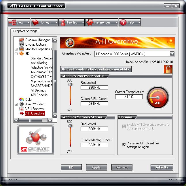 ถ้าจะลากการ์ดให้ไกลกว่านี้ ก็คงต้องใช้พวกโปรแกรมIndyทั้งหลาย ที่ไม่ได้รับการรับรองจากATI มาช่วยครับ เท่าที่ผมลองไปหาตามเวบไซด์ต่างประเทศ ตัวที่นิยมใช้กับการ์ดตระกูลX1800ในตอนนี้มากที่สุด ก็คือโปรแกรมที่ชื่อ Overclocker จากเวบไซต์ driverheaven.net นั่นเองครับ