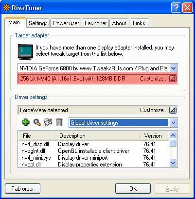 และเมื่อกลับมาเข้าวินโดว์อีกครั้ง ก็ให้ลองเปิดโปรแกรมRiva Tunerอีกครั้ง เพื่อเช็คดูว่าที่เราเปิดท่อสำเร็จหรือไม่ ถ้าสำเร็จ โปรแกรมก็จะแจ้งเราว่าการ์ดเราเป็น “256-bit NV40 (A1,16×1,6vp) with 128MB DDR” ตามรูปเลยครับ
