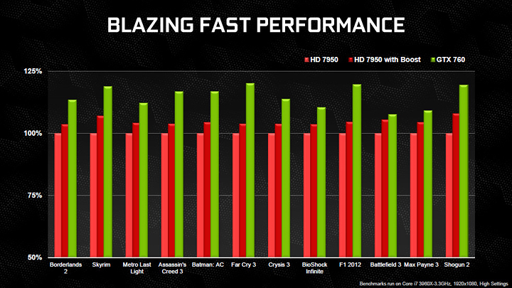 ประสิทธิภาพเบื้องต้นเมื่อทำการใช้งานบนเกมส์ที่เป็นที่นิยมในปัจจุบันนี้จะเห็นได้ว่า GeForce GTX 760 นั้นแสดงศักยภาพได้สูงกว่ากราฟฟิกการ์ดคู่แข่งอย่างเห็นได้ชัด