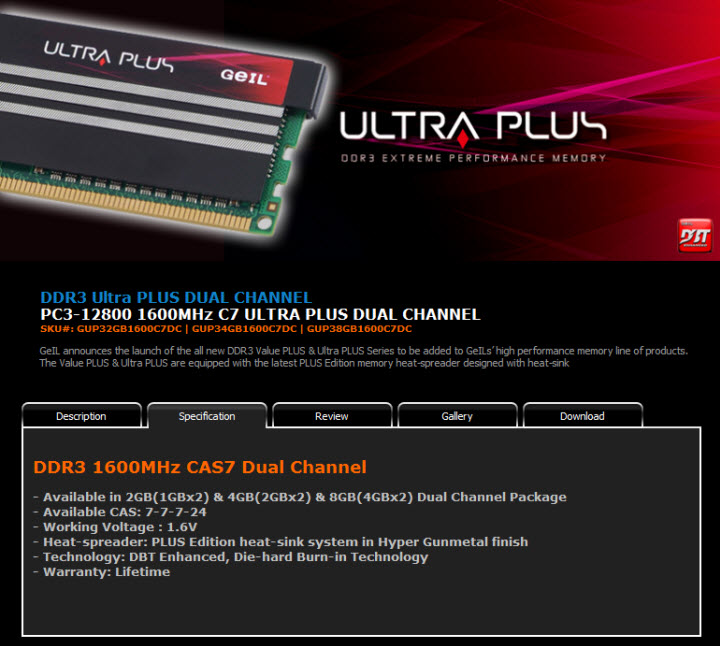 สวัสดีครับ กลับมาอีกครั้งกับ Memory Review อีกแล้ว อย่าเพิ่งเบื่อกันนะครับ ช่วงนี้แรมเข้า อิอิ กำ วันนี้เรามาดูแรมราคาไม่แพงจากแบรนด์ GEIL ดูกันบ้างครับ ช่วงหลังๆที่ผมได้ทำการเทสแรมไปนั้น ส่วนใหญ่จะเจอแต่แรมที่วิ่งกันบัสสูงๆ Timing แน่นๆ แต่นั่นก็ต้องแลกมาด้วยค่าตัวไม่ใช่น้อย แพงไม่ว่าหาซื้อไม่ได้ตามบ้านนอกนี่สิเป็นเรื่องครับ เดี๋ยวเรามาดูกันครับว่า GEIL ULTRA PLUS PC3 12800 2GB x 2 Kit ในรูปแบบสองแถว สี่กิ๊ก ก็จะยังคงปรับตัวคูณสูงสุดและปรับ BCLK ขึ้นไปเท่าที่ระบบจะมีเสถียรภาพขั้นสูงสุดตามสไตล์ของ Vmodtech.com มาดูสเปกจากหน้าเว็บของ Geil กันก่อนครับ