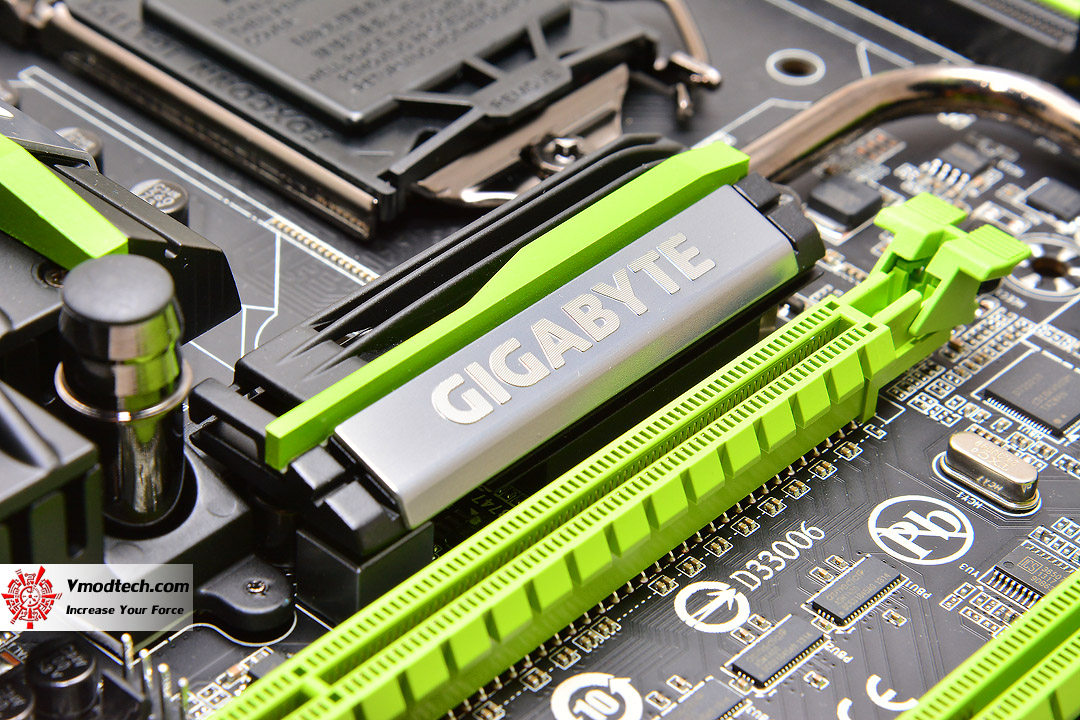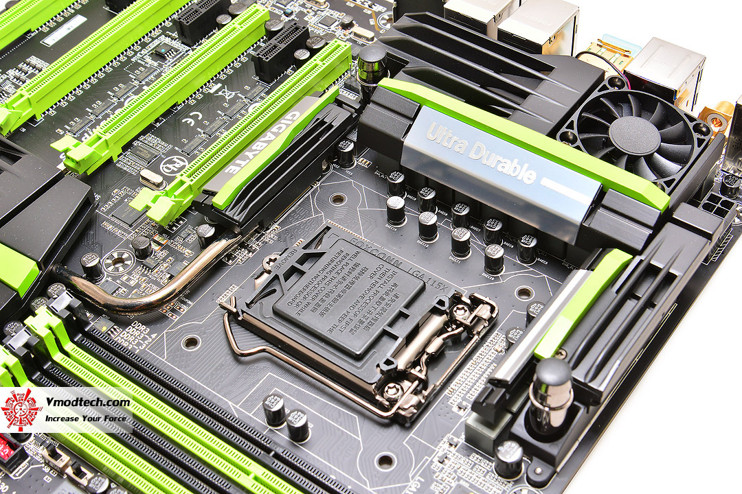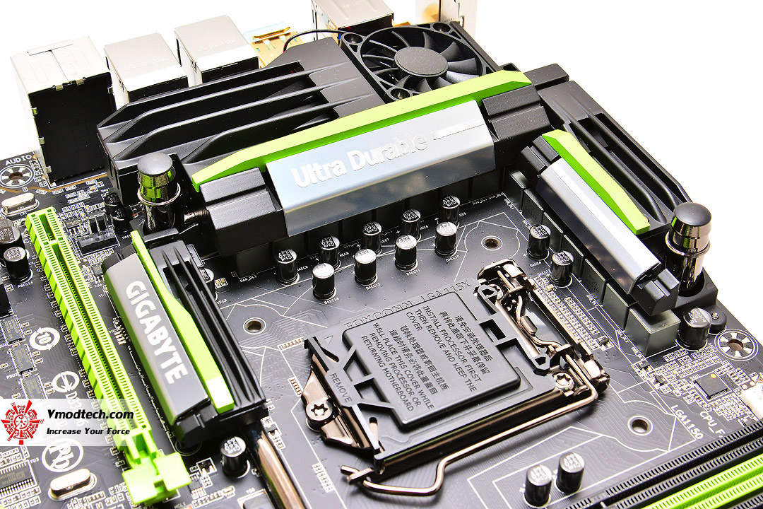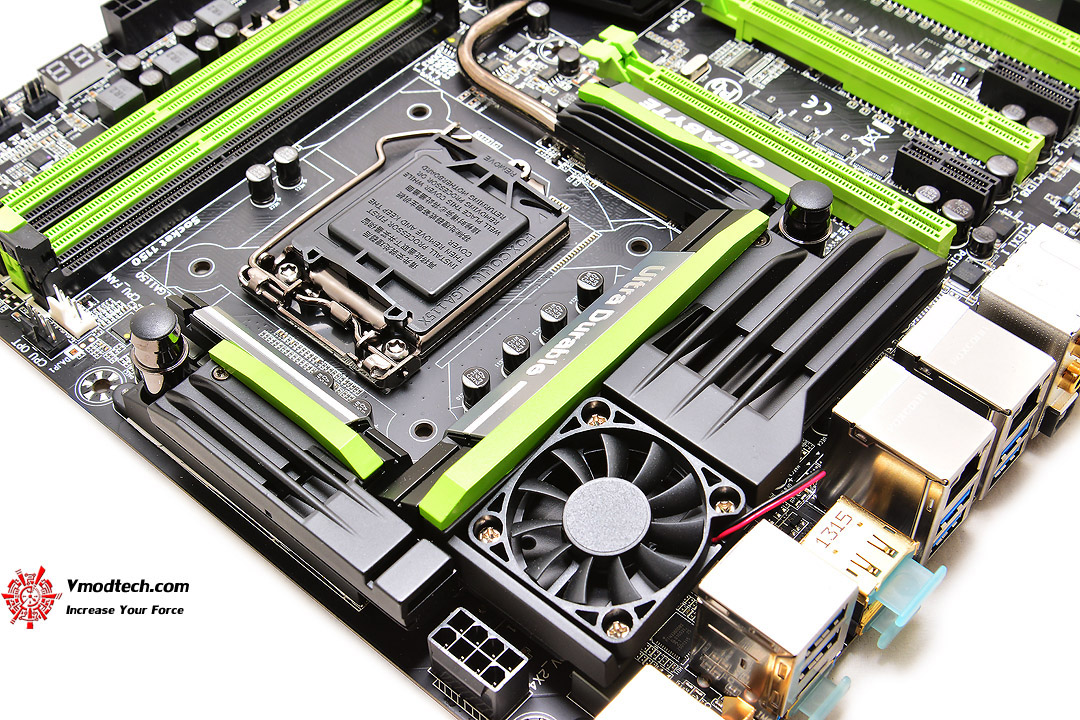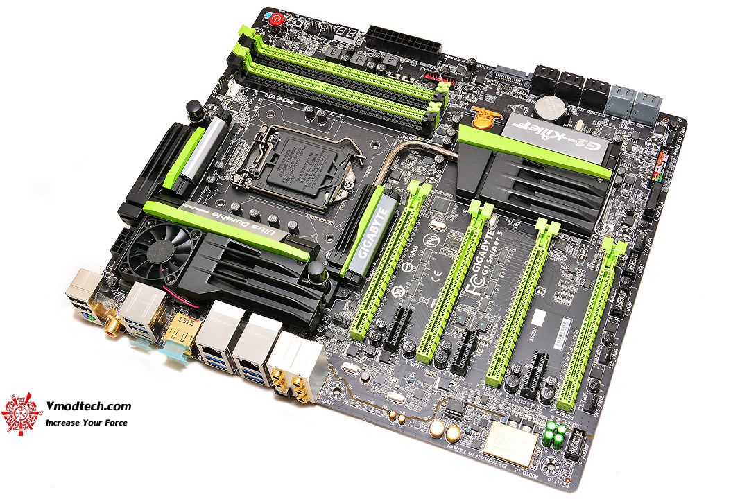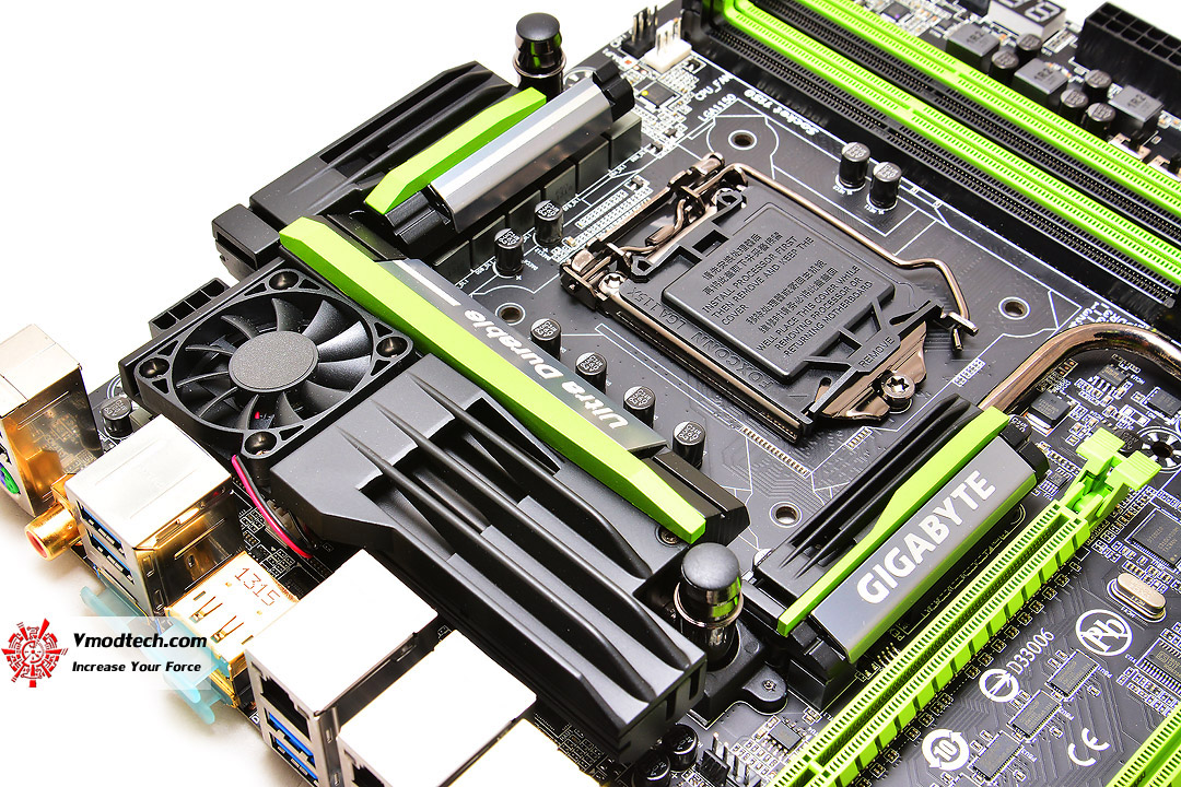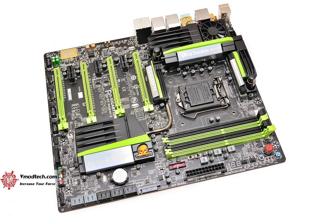 หน้าตาของมาเธอร์บอร์ดรุ่นนี้ จะออกแนวเข้มขรึมดำตัดเขียว ตามคอนเซปต์ของบอร์ดรุ่นเกมเมอร์จาก GIGABYTE ครับ