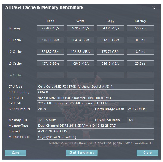 AIDA64 MEM ก็แรงดี ทั้งแบรนดวิธต่างๆการอ่านเขียนอยู่ที่ 27503MB/s และ 18917MB/s ตามลำดับครับ ก็แรงโอเคในเรทของบัสแรม 2400Mhz ครับของซีพียู AMD FX