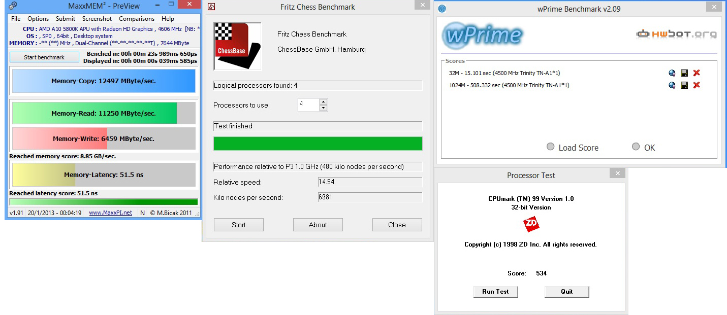 wPrime2.09 , CPUMark99 MaxxMem & Fritz Chess Benchmark