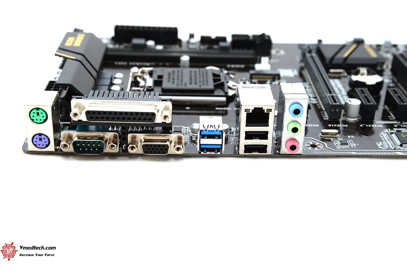มาดูพาแนล ด้านหลังกันบ้างครับ ประกอบด้วย 1 x PS/2 mouse port , 1 x PS/2 Keyboard port , 1 x parallel port , 1 x serial port , 1 x D-Sub port , 2 x USB 3.0/2.0 ports , 2 x USB 2.0/1.1 ports , 1 x RJ-45 port , 3 x audio jacks (Line In, Line Out, Mic In)