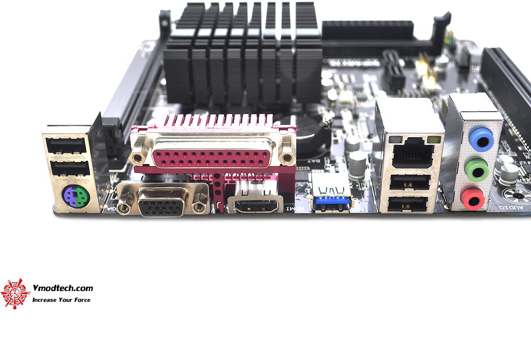 พาแนลด้านหลังประกอบด้วย 1 x PS/2 keyboard/mouse port , 1 x D-Sub port , 1 x HDMI port , 1 x parallel port , 1 x USB 3.0/2.0 port , 4 x USB 2.0/1.1 ports , 1 x RJ-45 port , 3 x audio jacks (Line In, Line Out, Mic In) จะเห็นได้ว่ามีพอต parallel สำหรับเชื่อมต่อปริ้นเตอร์รวมอยู่ด้วยครับรวมไปถึงช่องเชื่อมต่อสำคัญๆต่างๆที่เน้นการใช้งานทั่วไปครับ