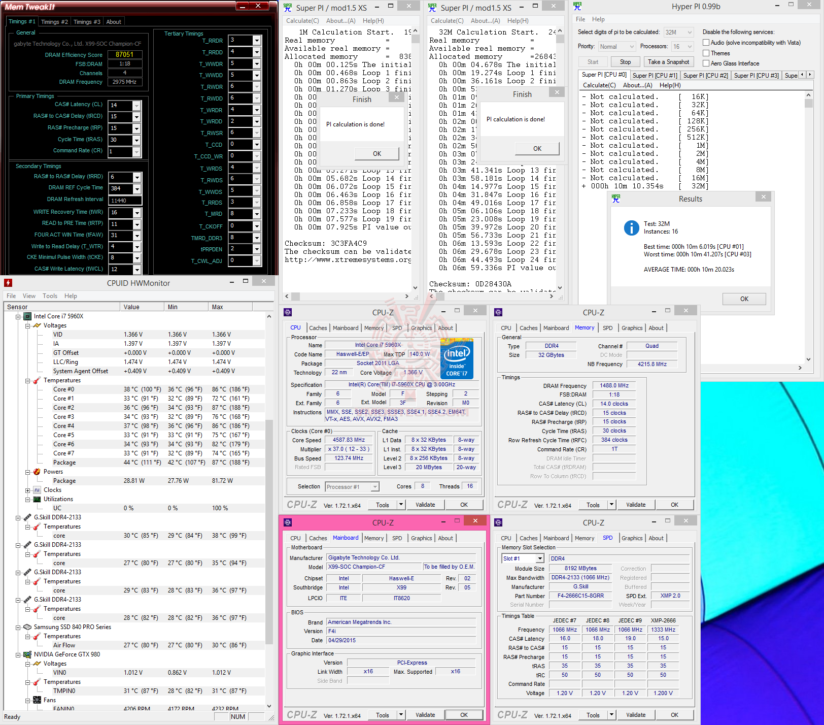 …แรงเสถียรผ่านกันแบบนิ่มๆ กับ SuperPI 32M พร้อมกัน 16 เธรด ด้วยเวลาเฉลี่ยทุกๆเธรดที่ 10.20.023 นาที แม้จะใช้ Sub-Timing หลวมๆก็ตาม แรงสุดติ่งกันจริงๆครับสำหรับ GIGABYTE GA-X99-SOC Champion