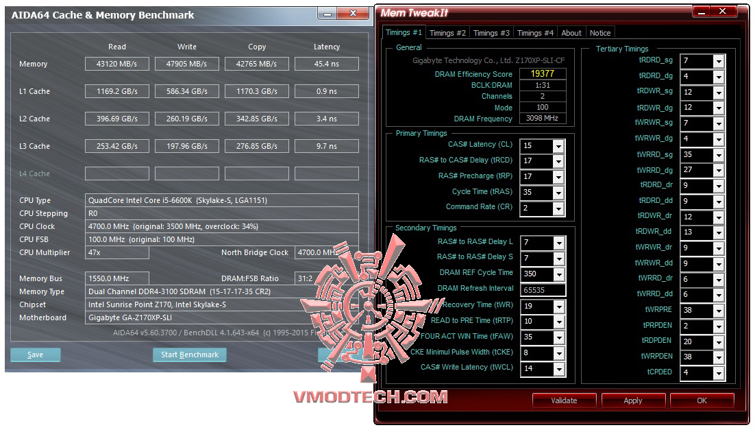 AIDA64 MEM ก็แรงดี ทั้งแบรนดวิธต่างๆการอ่านเขียนอยู่ที่ 43120MB/s และ 47905MB/s ตามลำดับครับ ก็แรงโอเคในเรทของบัสแรม 3100Mhz ครับ