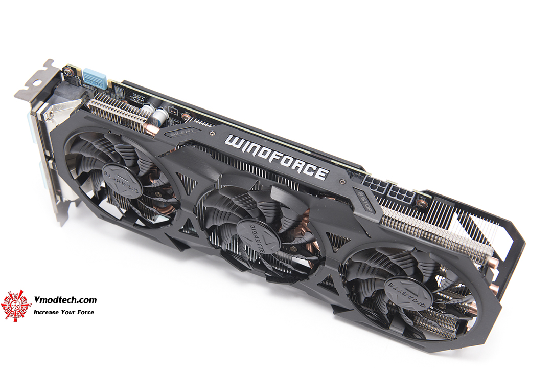 ต้องการไฟจากหัว PCIe แบบ 6 พินสองหัวครับ และเมื่อมองจากมุมนี้จะเห็น Logo Windforce ขนาบซ้าย/ขวาด้วยโลโกเรืองแสงคำว่า Silent และ Stop ขึ้นอยู่กับสถาณการณ์ว่าขณะนั้นพัดลมทำงานหรือเปล่า